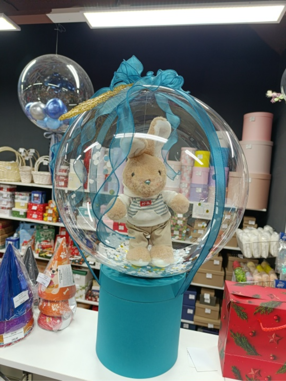 Бабл бокс «Зайка в бирюзе» — трогательный подарок с игрушкой внутри прозрачного шара, закреплённого на коробке. Такой формат коробки-сюрприза выглядит объёмно, мило и сразу привлекает внимание. Композиция красиво смотрится в интерьере и на фото, а внутрь коробки можно положить конфеты или небольшой дополнительный подарок.