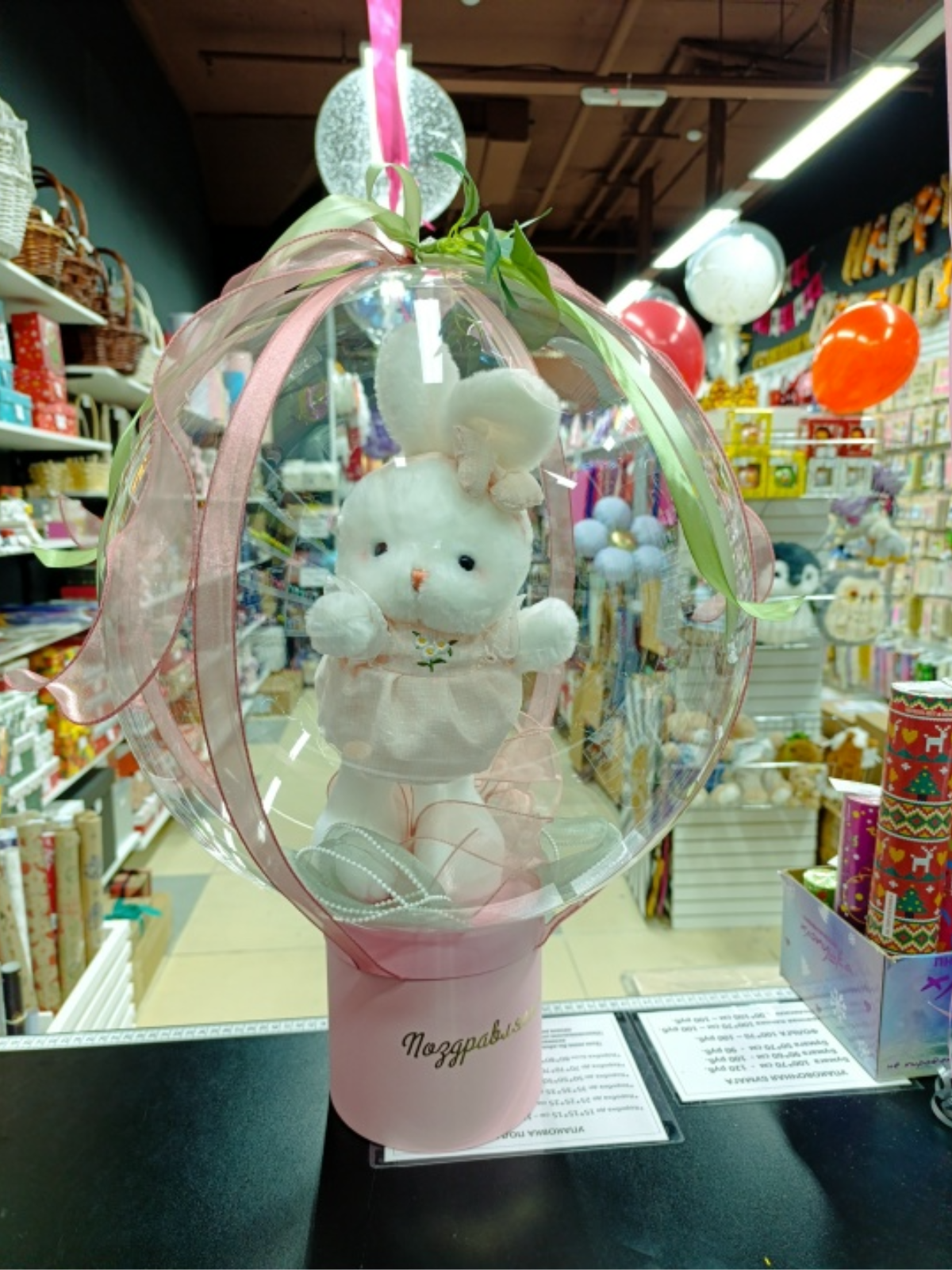 Бабл бокс «Зайка в сарафане» — трогательный подарок на день рождения или просто как милый сюрприз. В прозрачном шаре размещена зайка, а сама композиция установлена на коробке, внутрь которой можно положить конфеты или небольшой дополнительный подарок. Такой формат коробки-сюрприза выглядит необычно, долго радует и красиво смотрится на фото в детской комнате или в праздничной зоне.