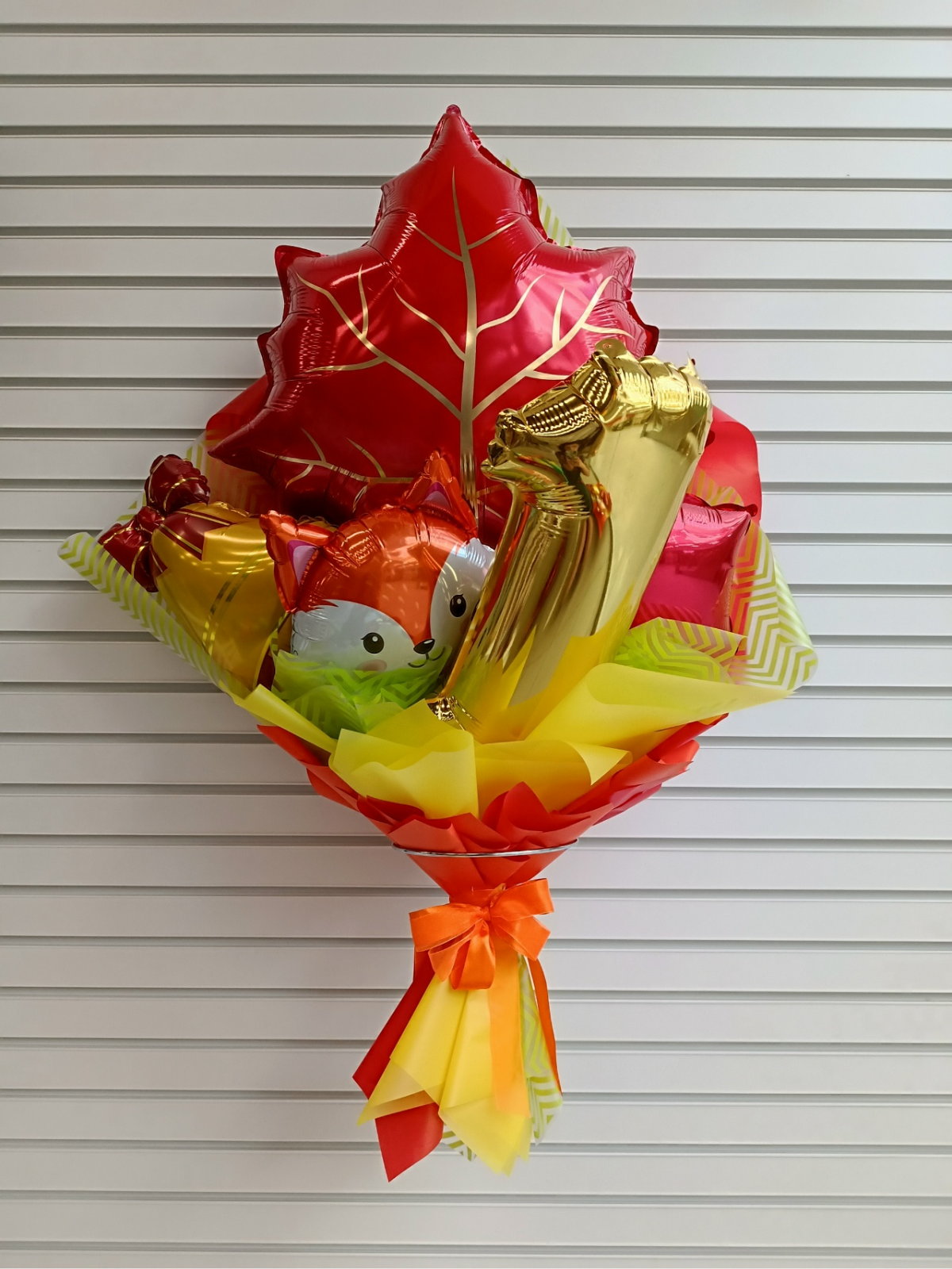 Букет из шаров «Школьный лисёнок» — яркий и необычный подарок с осенним настроением, который отлично подходит для начала учебного года. Композиция собрана из фольгированных шаров и выглядит выразительно, празднично и очень фотогенично.