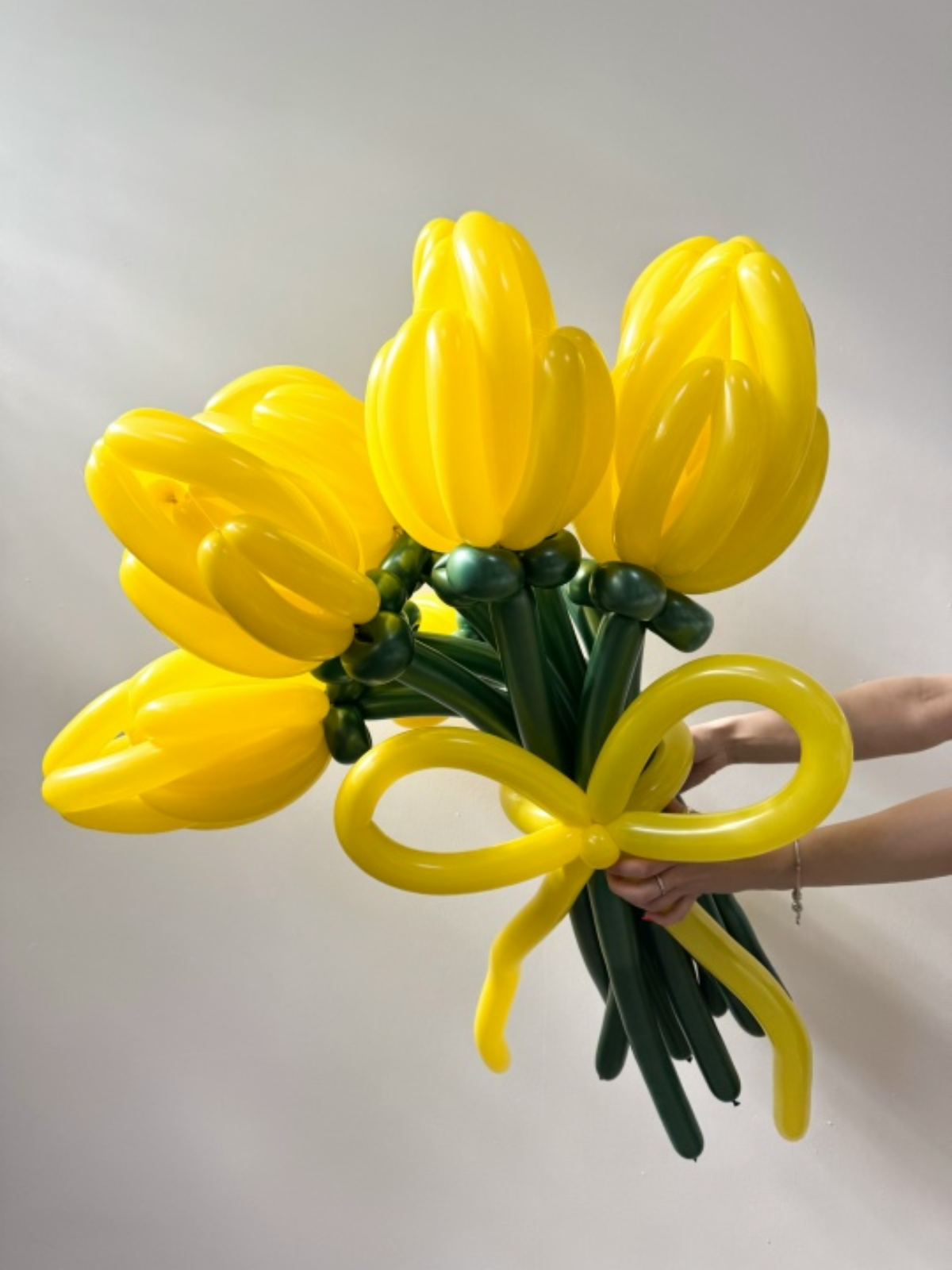 Букет из шаров «Солнечные тюльпаны» — оригинальный подарок, выполненный по специальной технике из шаров для моделирования. Такая композиция выглядит необычно, аккуратно и празднично, поэтому отлично подходит для яркого поздравления и красивого сюрприза.