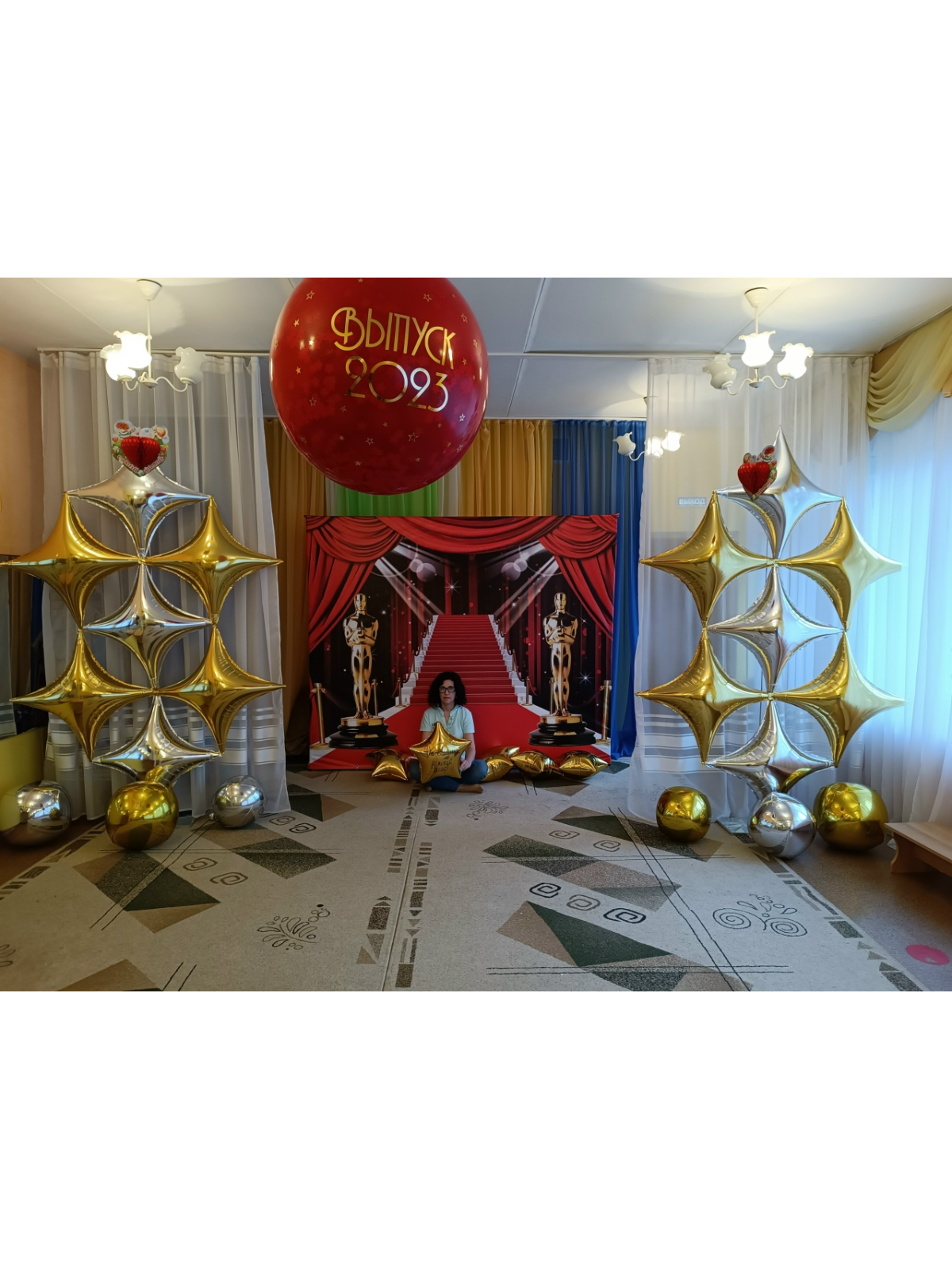 Оформление выпускного в детском саду включает баннер на стойке, стойки из шаров «Сириус», большой шар 80 см с конфетти и звёзды с индивидуальными надписями.