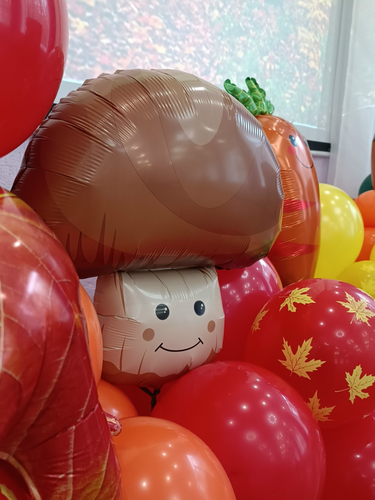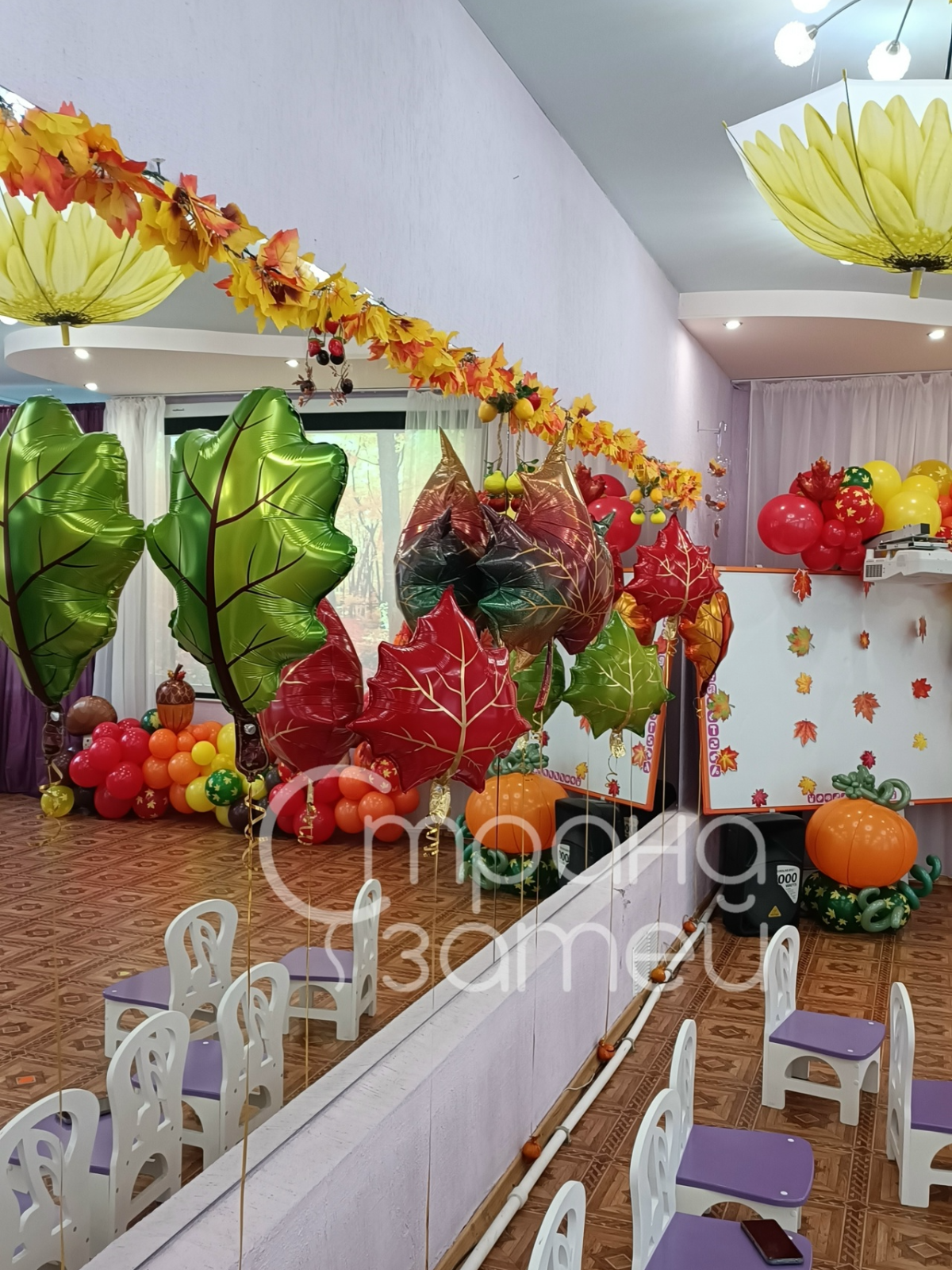 Оформление зала на праздник Осени в детском саду включает разнокалиберную гирлянду 6 м с декором из фольгированных шаров, листья, тыкву из шаров и бумажные осенние элементы.