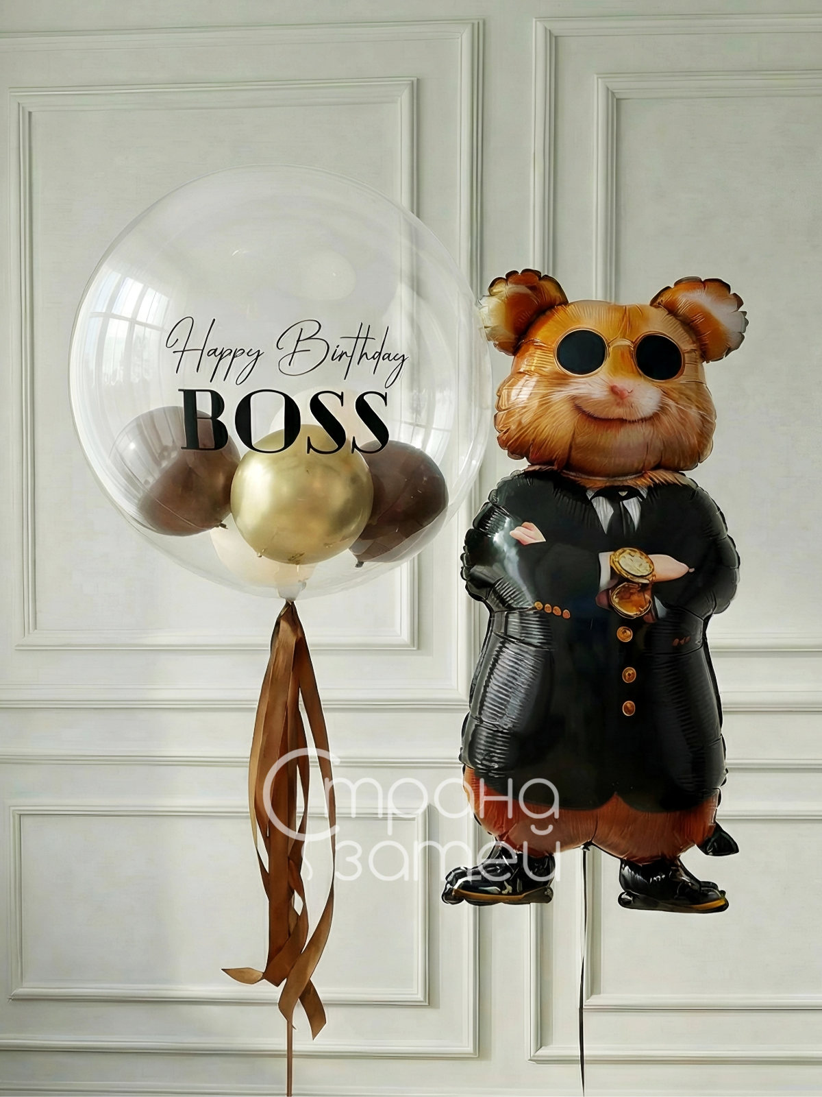 Шары для босса выбирают тогда, когда важно поздравить уместно, современно и заметно. Сет «Босс на стиле» собран в деловом настроении: шар-бабл с наполнением и надписью делает подарок персональным, а фигура «Деловой Хомяк» добавляет характер и запоминающийся акцент.