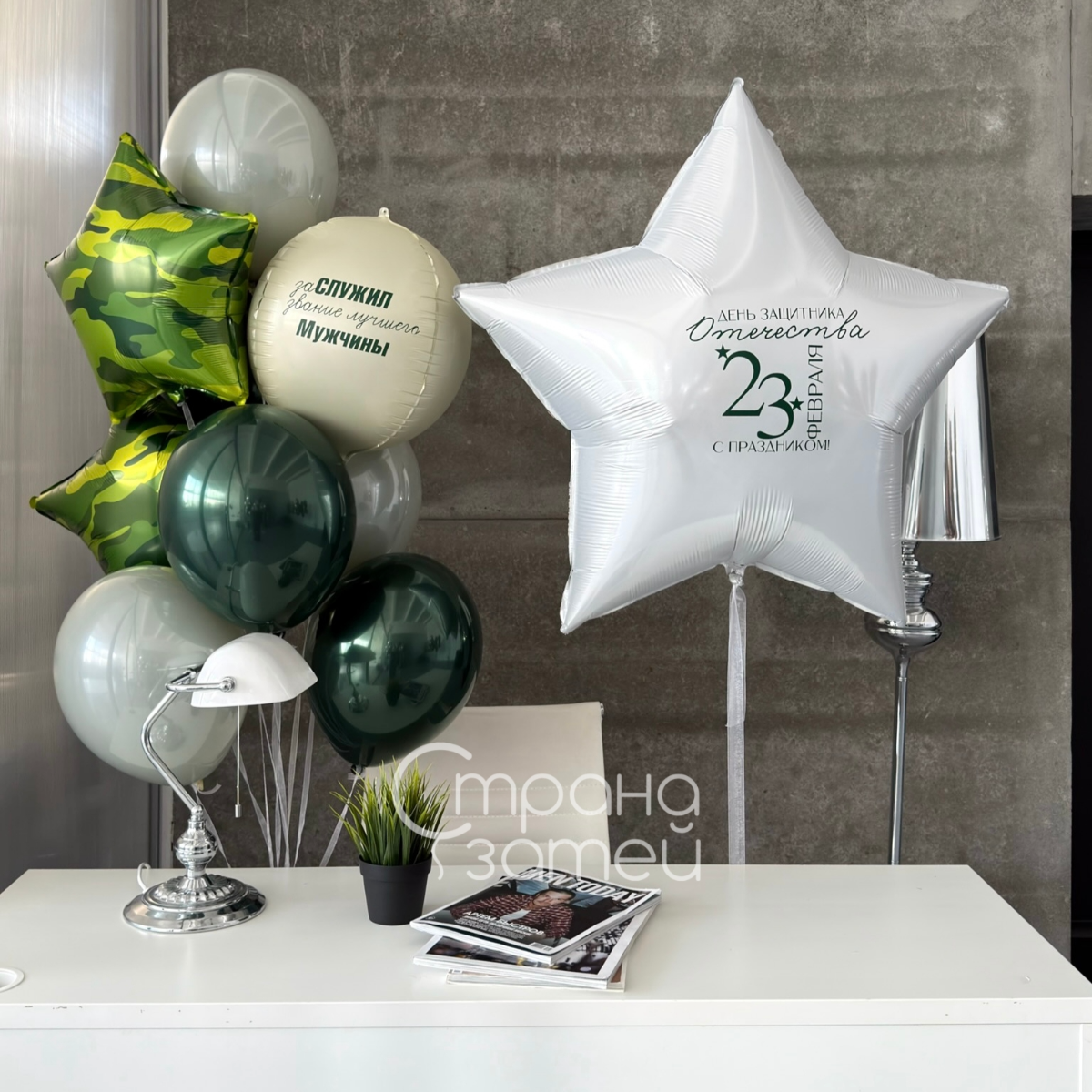 Сет «Камуфляжный десант» в серо‑зелёной палитре создаёт атмосферу 23 февраля без лишней вычурности. Большая звезда с поздравлением выделяет главного героя, а фонтан с камуфляжными звёздами и дабл‑шарами добавляет объём и делает композицию заметной даже в большом помещении. Такой сет уместен для офиса, дома или ресторана и может стать готовой мини‑фотозоной.