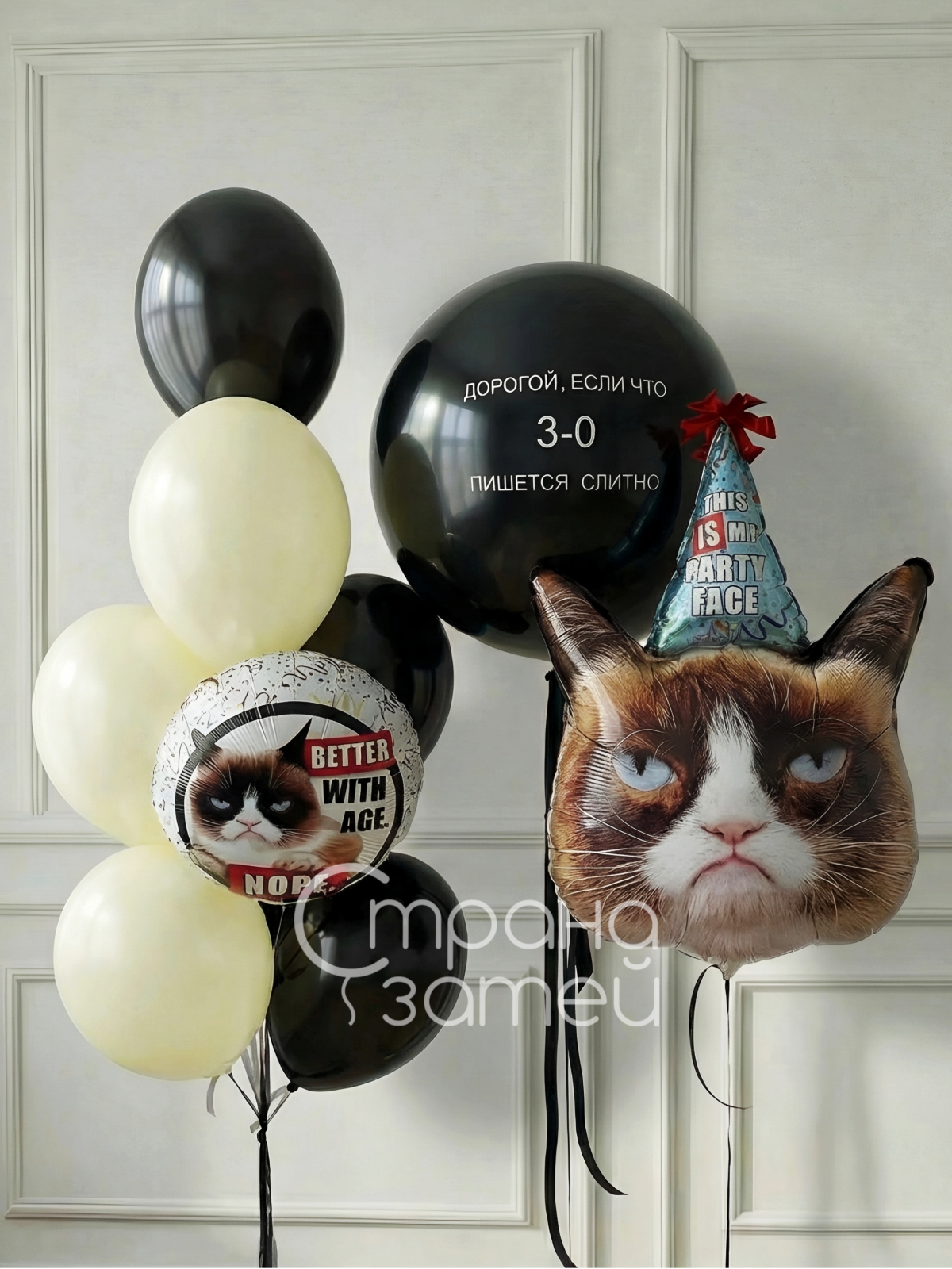 Сет шаров для него с фигурой «Сердитый кот» и большим шаром-гигантом — оригинальный вариант для мужского дня рождения.