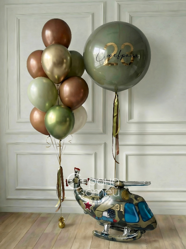 Тематическая композиция для 23 февраля в стильной «мужской» гамме: эффектный шар-гигант с индивидуальной надписью, фонтан из хромовых и пастельных шаров и вертолёт (фигура на воздухе, не летает). Сет отлично выглядит на фото и подходит для дома, офиса или праздничного стола.