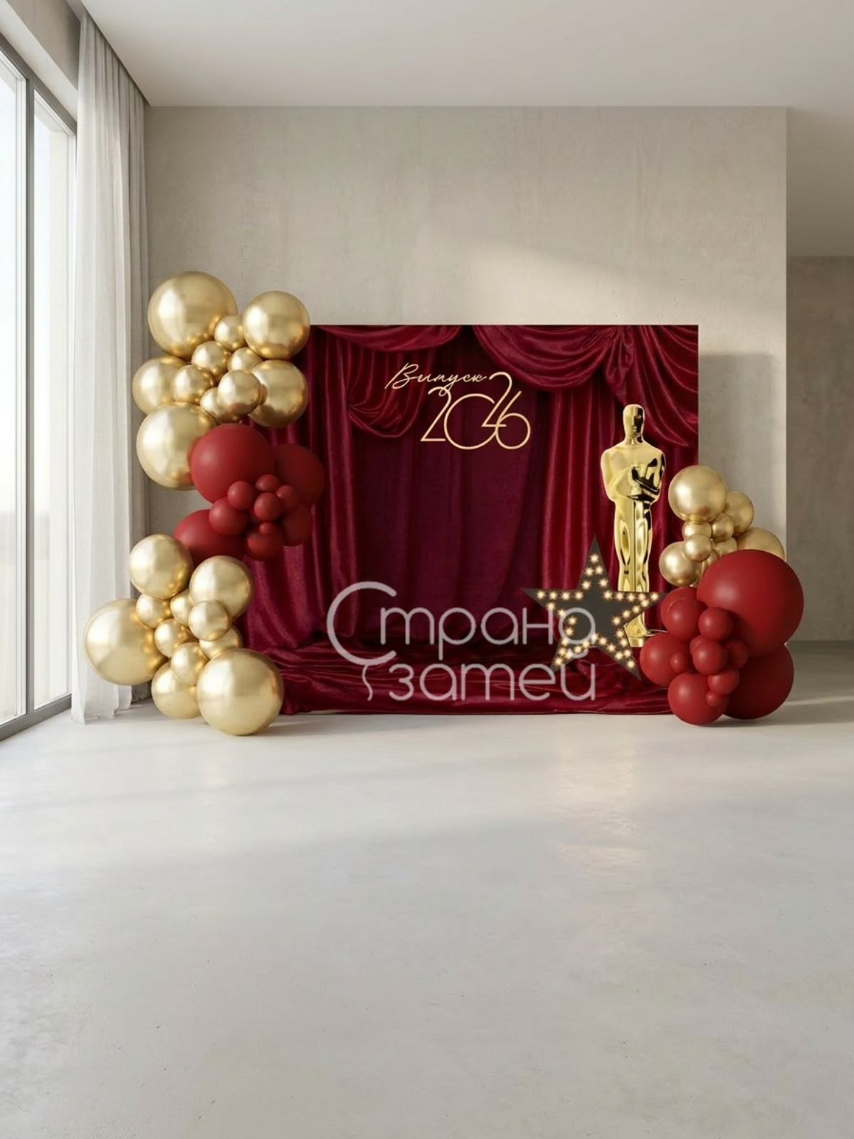 Эта фотозона помогает создать торжественное настроение и оформить красивую зону для памятных фотографий. Глубокий цвет фона и объёмные шаровые гирлянды делают кадры выразительными и «праздничными» даже при обычном освещении.