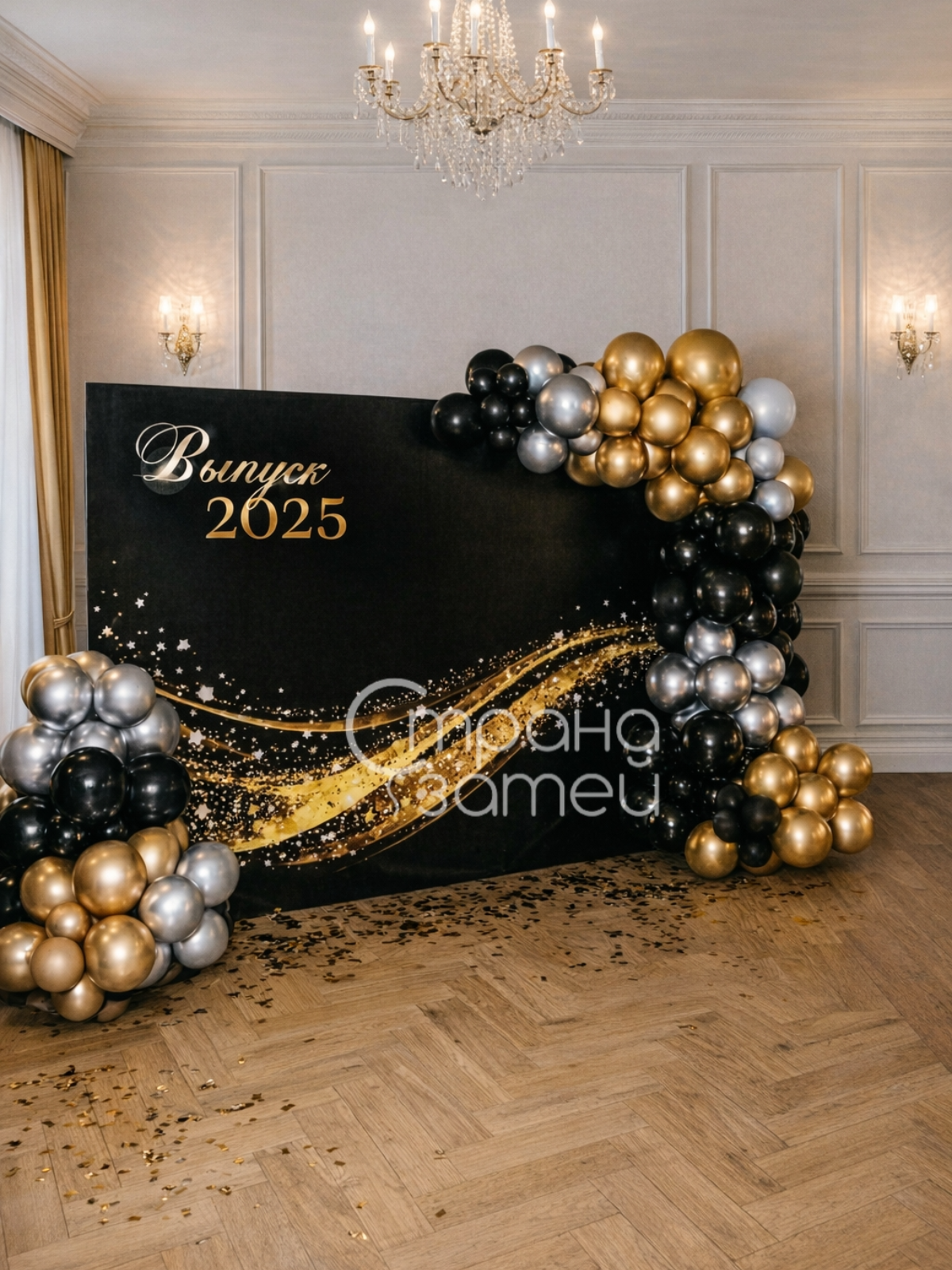 Фотозона из шаров «Черное золото» — эффектное оформление для выпускного вечера, которое помогает создать красивую торжественную атмосферу и выделить выразительную зону для памятных фотографий. Сочетание баннера и гирлянд из шаров смотрится современно, нарядно и очень празднично.