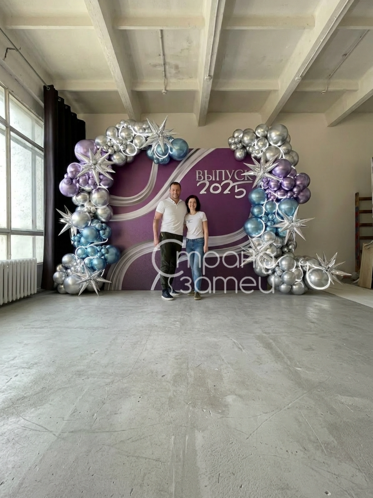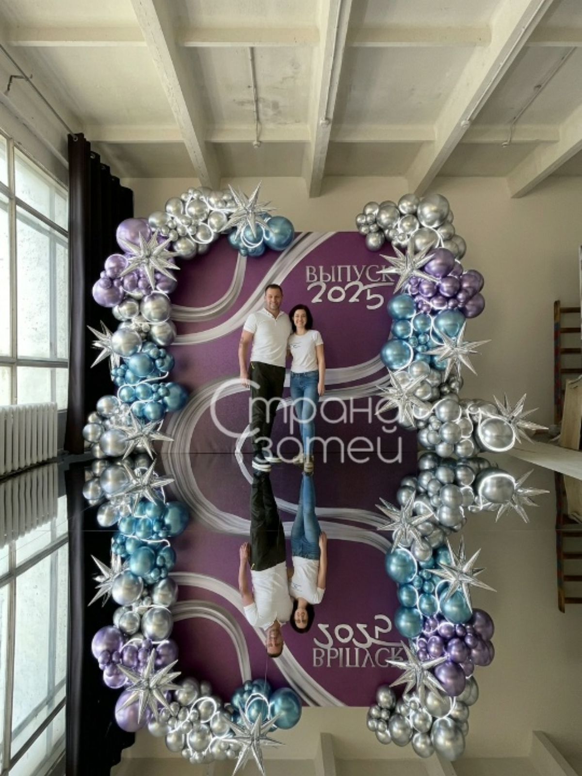 Светодиодная подсветка и хромовые шары дают красивое мерцание и отражения в кадре — фотозона сразу выглядит ярко и торжественно. Баннерный фон собирает композицию, а оформление шарами добавляет объём и эффект сцены.