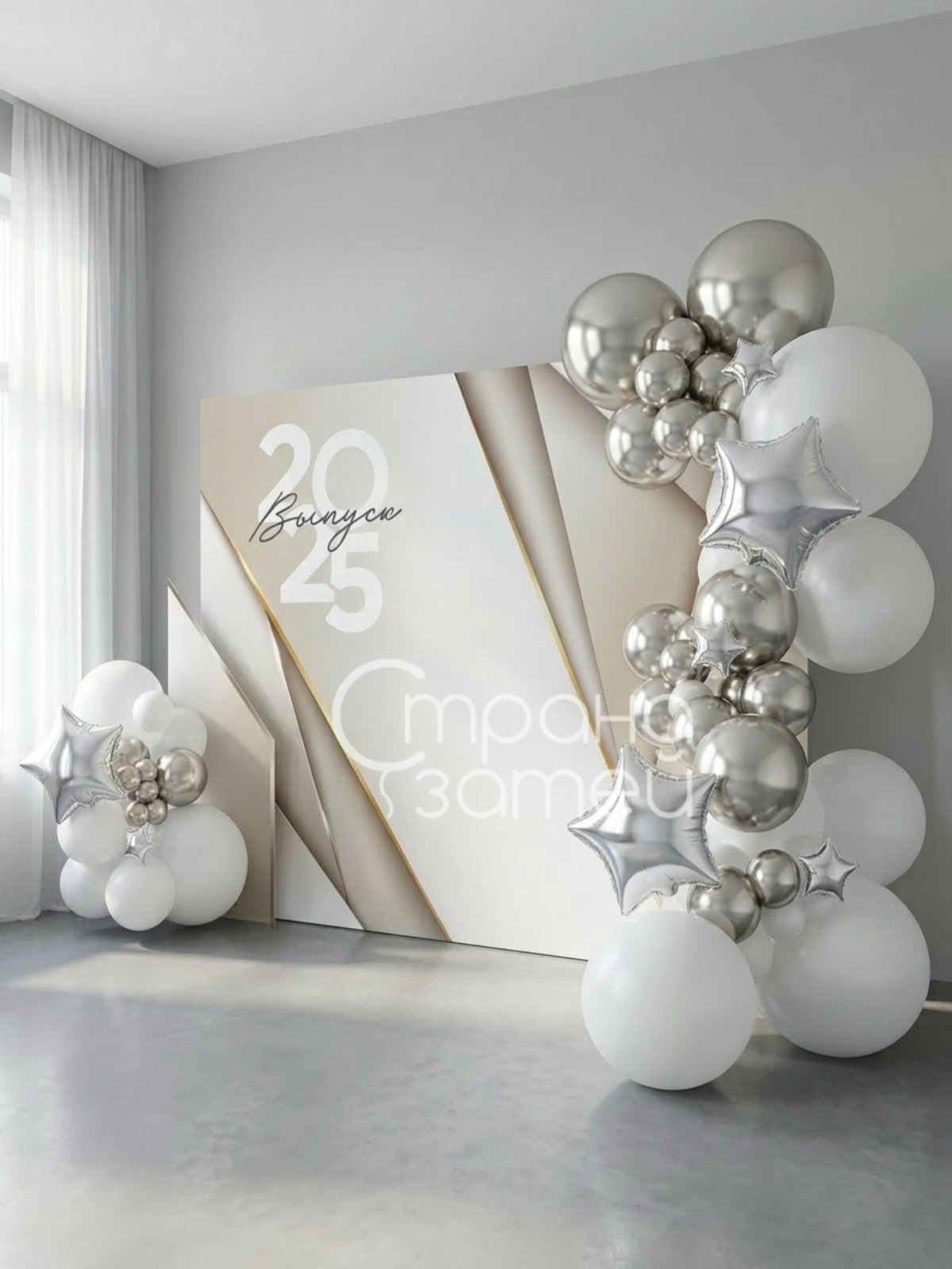 Эта фотозона создана для торжественных кадров: светлая гамма с серебряными акцентами выглядит современно и аккуратно, а шаровые гирлянды добавляют объём и праздничную фактуру. Формат с основным и дополнительным баннером помогает собрать композицию так, чтобы фон хорошо смотрелся и на общих фото, и на портретах.