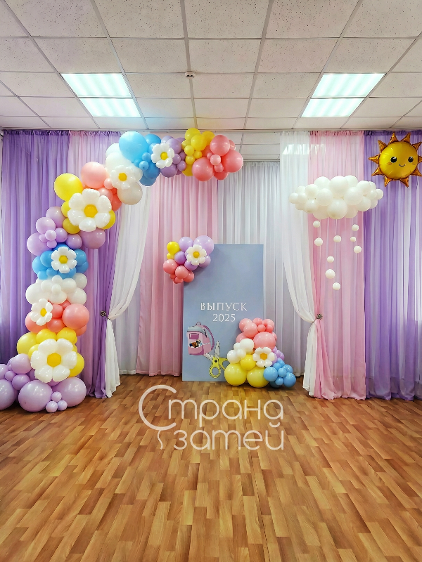 Решение отлично подходит на выпускной в детском саду: красиво смотрится у сцены или в отдельном фотоуголке, помогает организовать пространство и сделать торжественную часть более нарядной.
