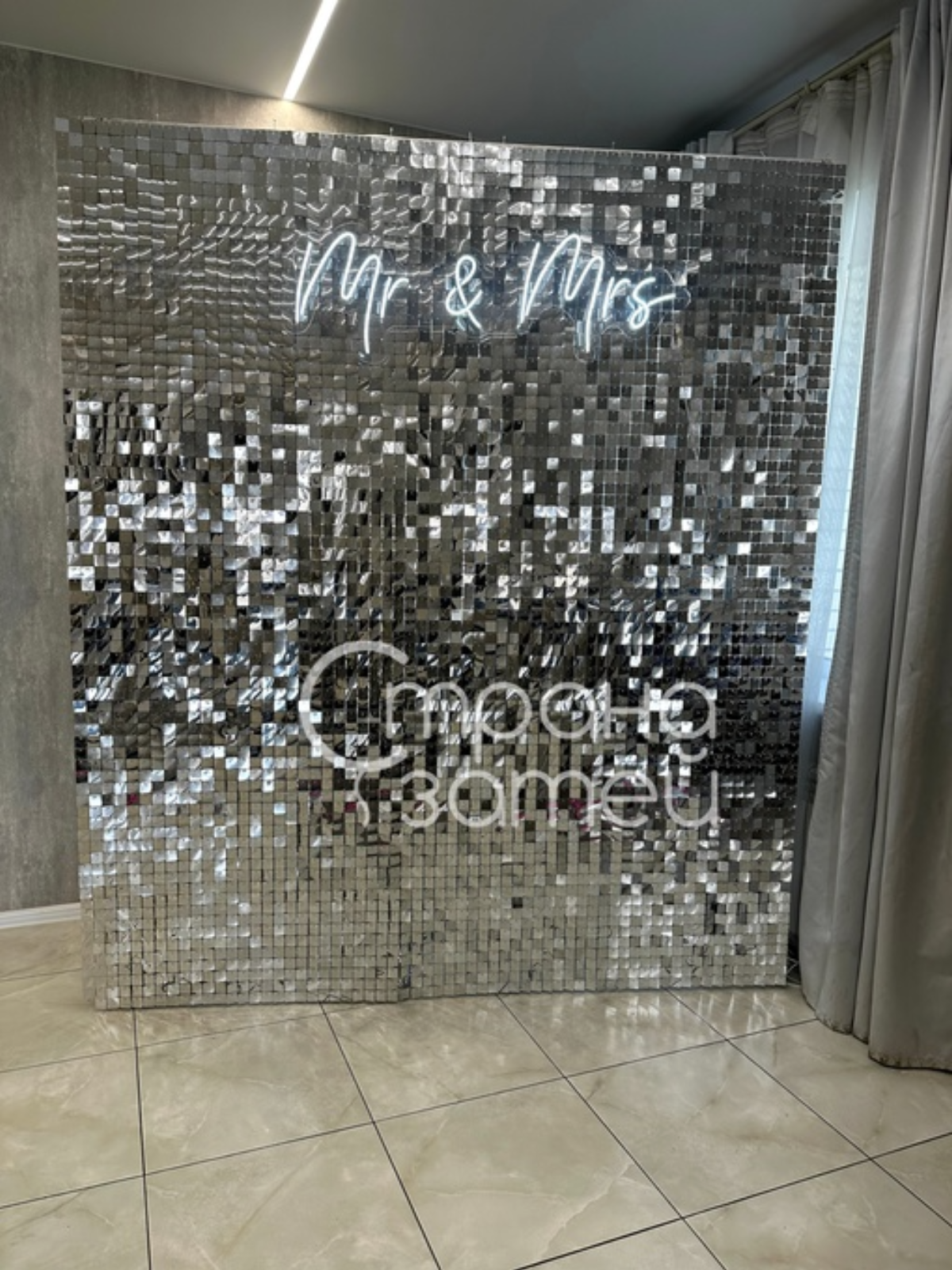 Эта фотозона создана для стильной свадьбы в узком кругу. Пайеточная панель красиво отражает свет, создавая эффектный фон для фотографий молодожёнов и гостей. Композиция смотрится аккуратно и современно, не перегружая пространство.