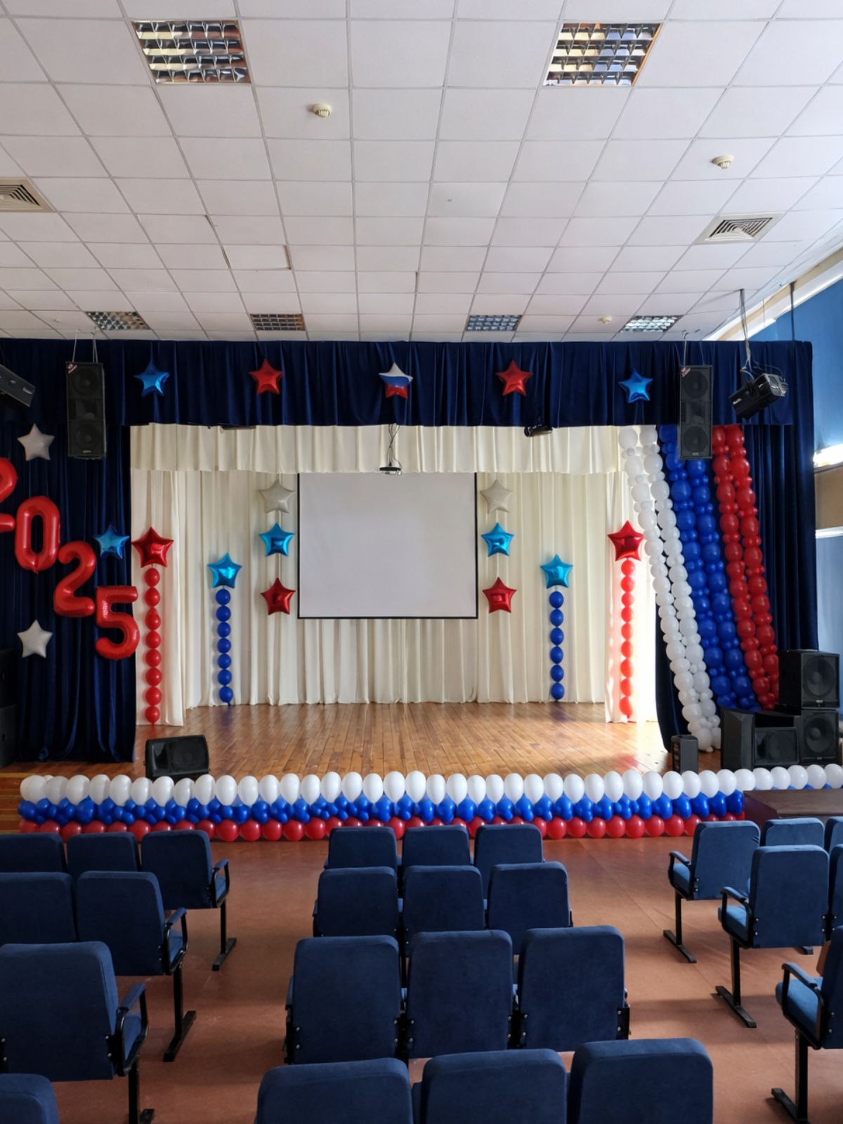 Подходит для актового зала и школьной сцены, когда нужен заметный декор без перегруженности.
