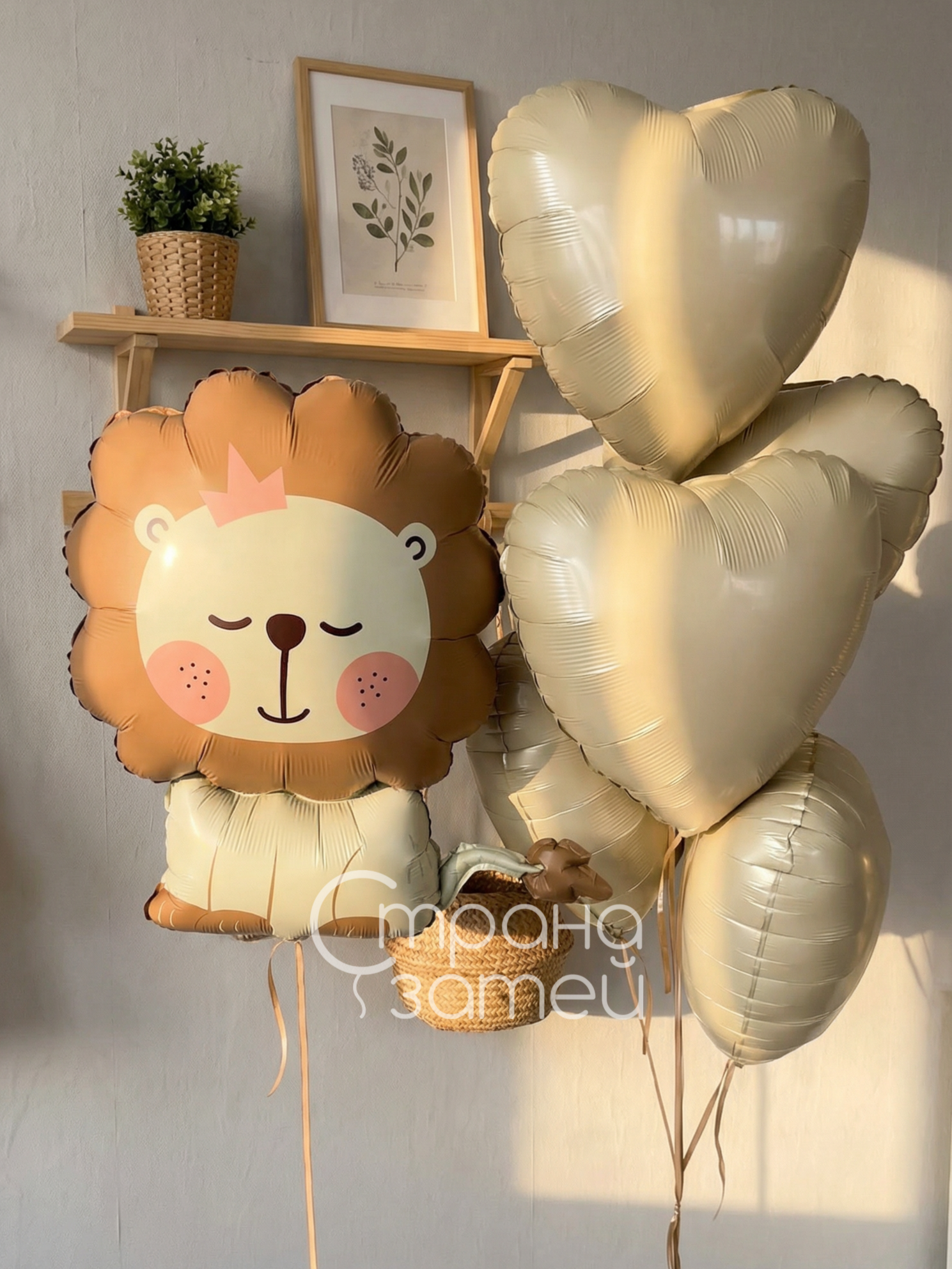 Сет шаров «Львенок‑обнимашка» — аккуратная композиция, которая сразу создаёт атмосферу праздника и красиво смотрится в комнате и на фотографиях.