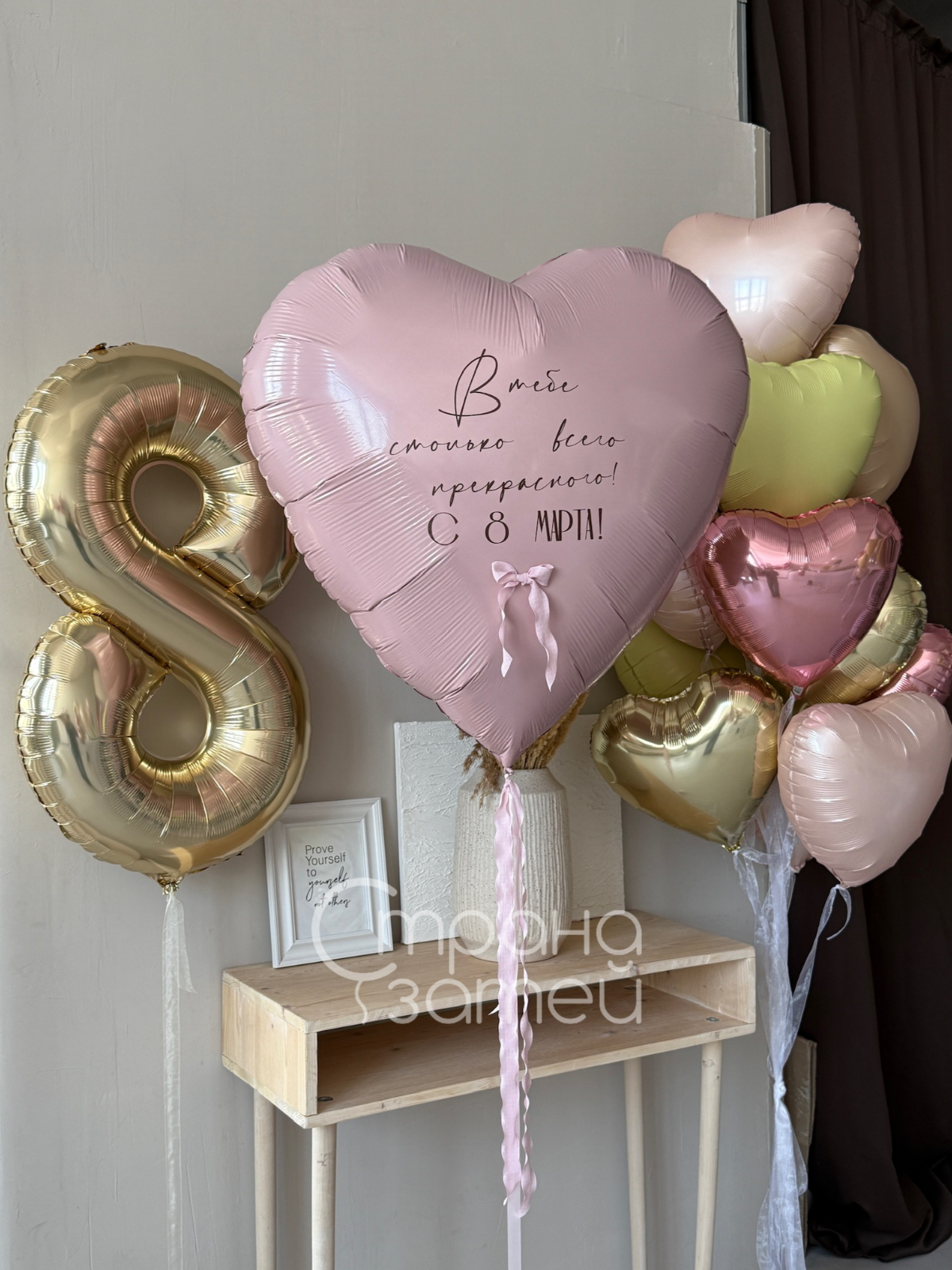 Текст на сердце-гиганте можно изменить под ваш повод: имя, обращение или короткое поздравление. По согласованию допускается лёгкая корректировка оттенков сердец в пределах похожей розово-золотой палитры, цифра остаётся 8 как символ 8 Марта.