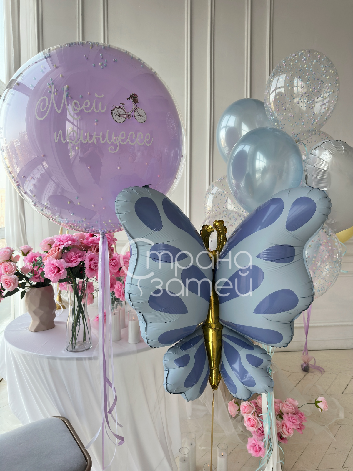 Сет шаров «Бабочка весны» — воздушное оформление в лилово‑голубой гамме. Большой дабл бабл с надписью «Моей принцессе», фигура бабочка и фонтан из шаров с пенопластом, металлика и сердца создают сказочное настроение и подойдут для девочки и девушки на 8 Марта или день рождения.Персонализация