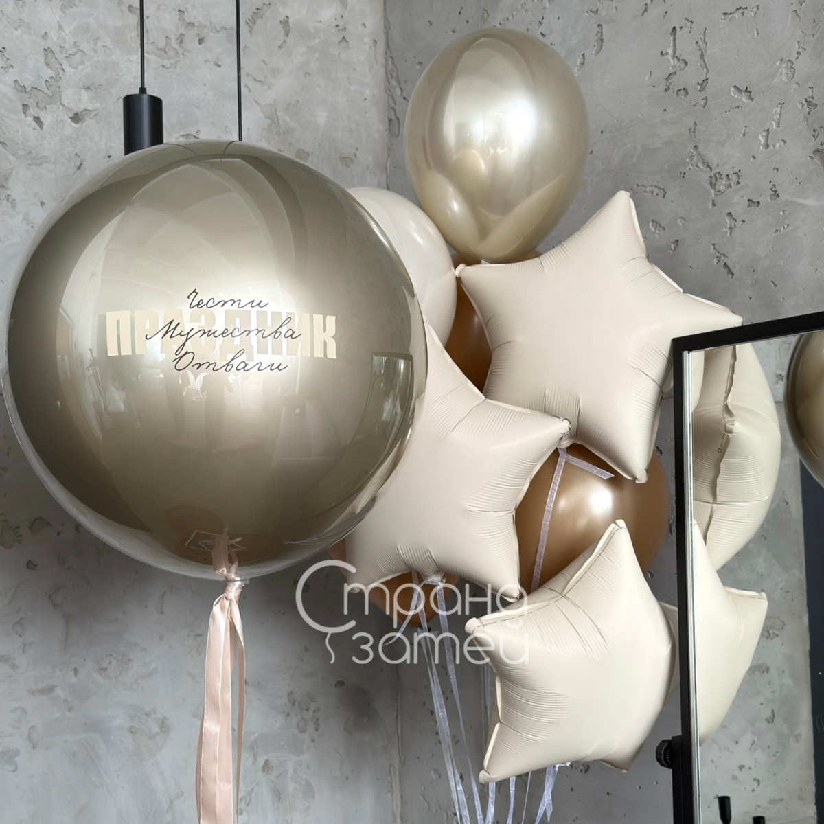 Сет «Честь и отвага» выполнен в спокойных бежево-золотистых оттенках и создаёт статусное оформление для мужских праздников. Шар‑гигант с персональной надписью подчёркивает повод, а фонтан из звёзд, дабл шаров хром и пастели формирует плотный, фактурный букет. Композиция хорошо смотрится в офисе, дома или в ресторане и может служить аккуратной мини‑фотозоной.
