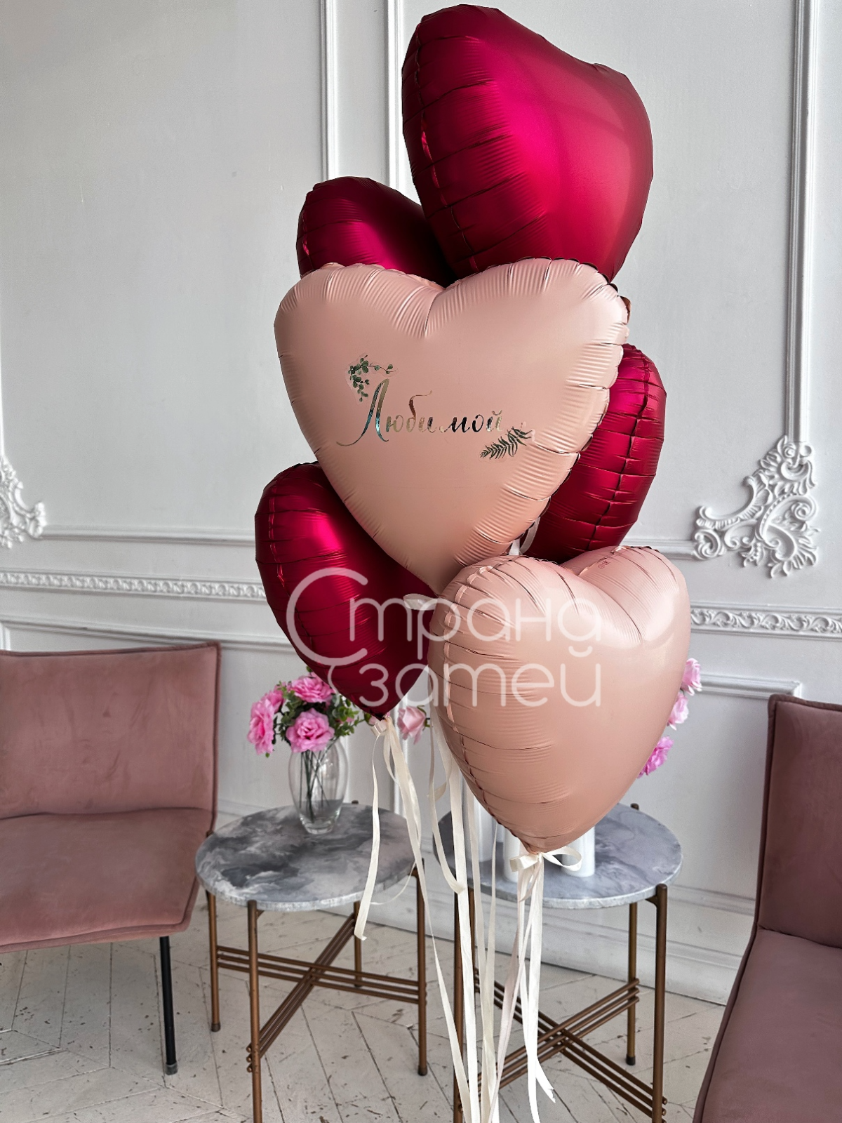 • Фонтан из 6 фольгированных шаров‑сердец 18″ на атласных лентах, одно сердце с надписью и декором