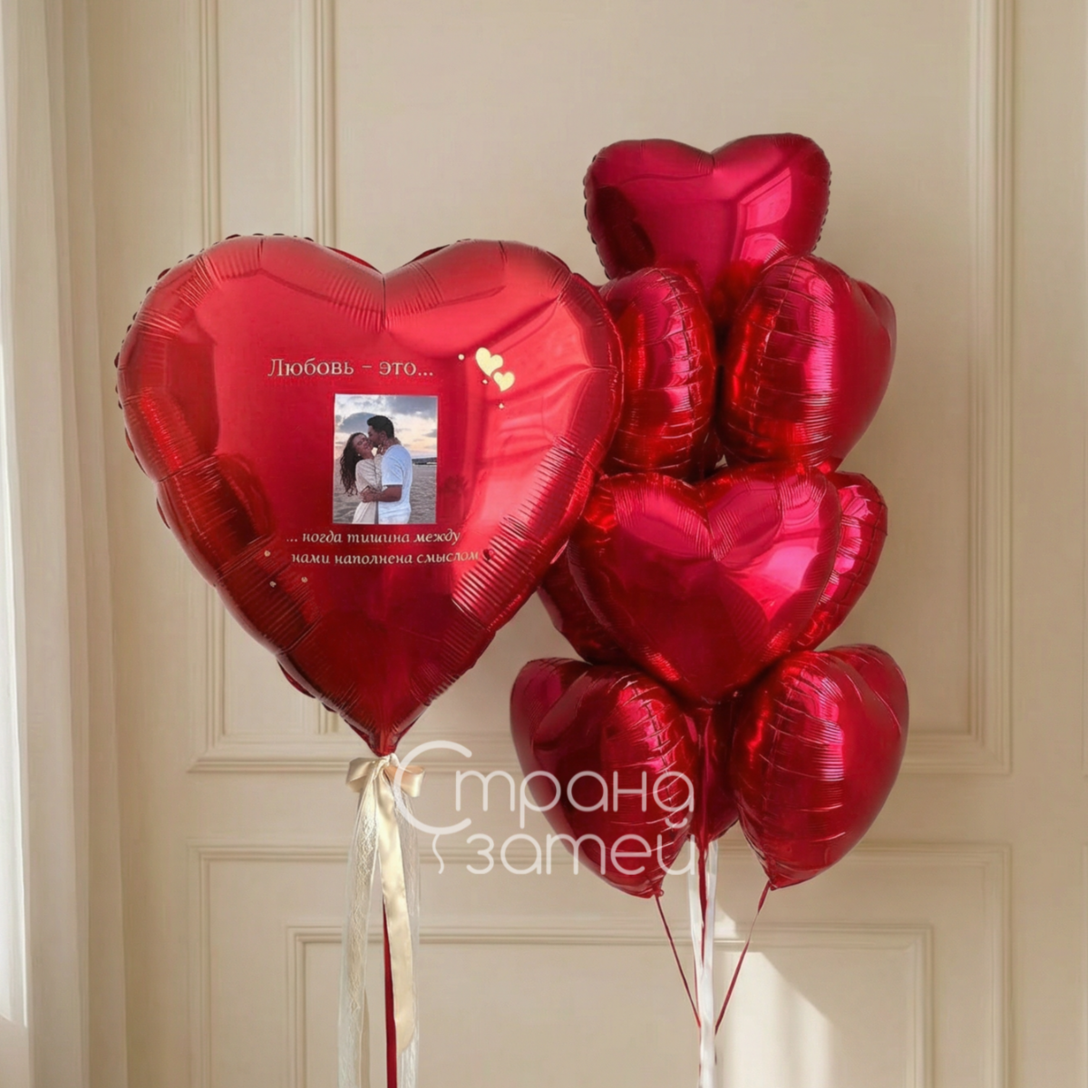 Яркий алый сет с большим фотосердцем и фонтана из десяти сердец — готовое решение для очень личного признания в любви. Все шары надуты гелием и собраны в аккуратную композицию, которая эффектно смотрится в интерьере и на фотографиях.