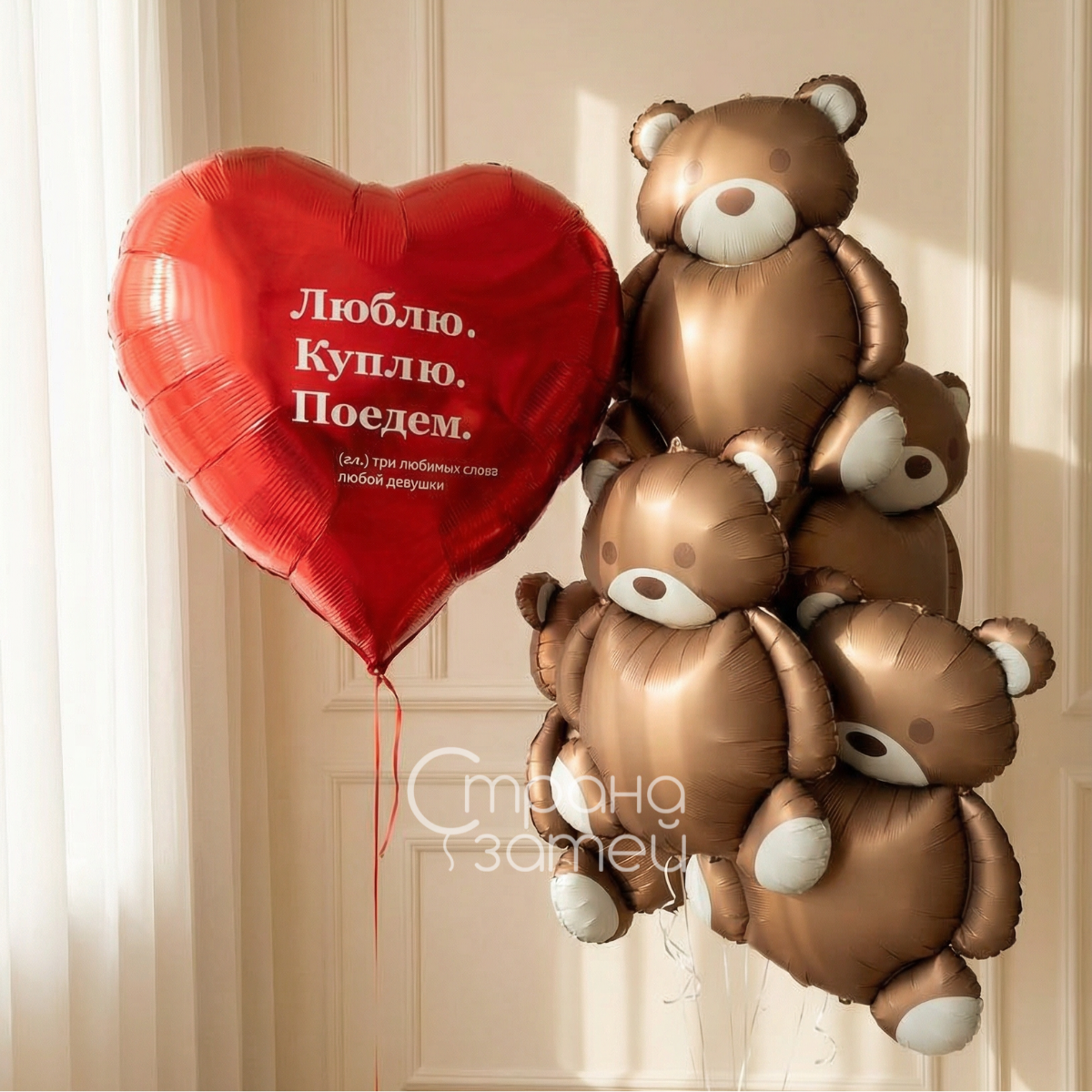 Романтичный и игривый сет с большим красным сердцем и фонтаном из шести шаров‑мишек — готовое решение для тёплого, немного шутливого признания в любви. Все шары надуты гелием и собраны в аккуратную композицию, которая эффектно смотрится в интерьере и на фотографиях.
