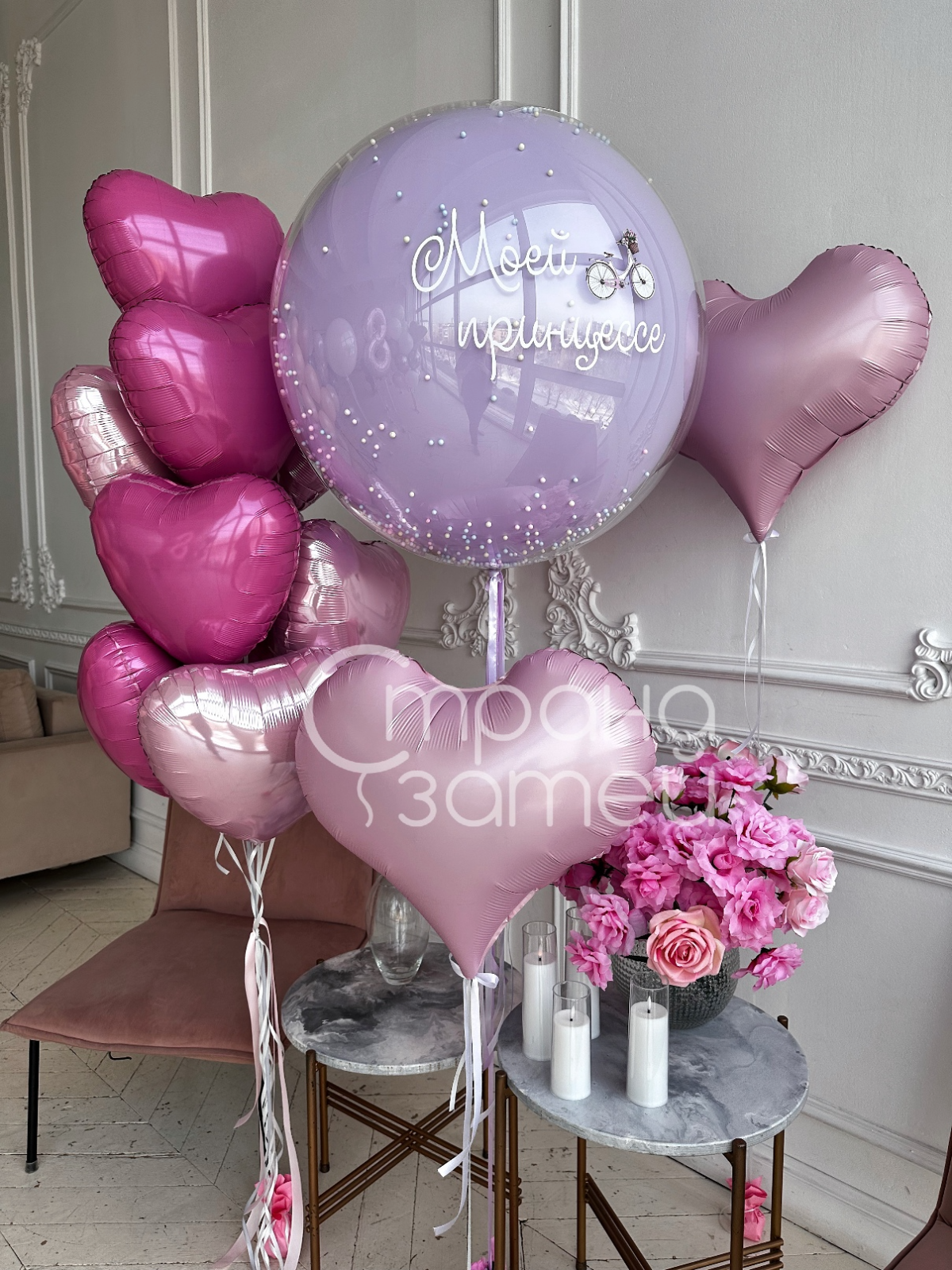 Сет шаров «Моей принцессе» — романтичное оформление в лилово‑розовой гамме. Двойной шар с надписью и фонтан из сердец создают нежный акцент для девушки или девочки на 8 Марта и день рождения, украшая дом или офис.