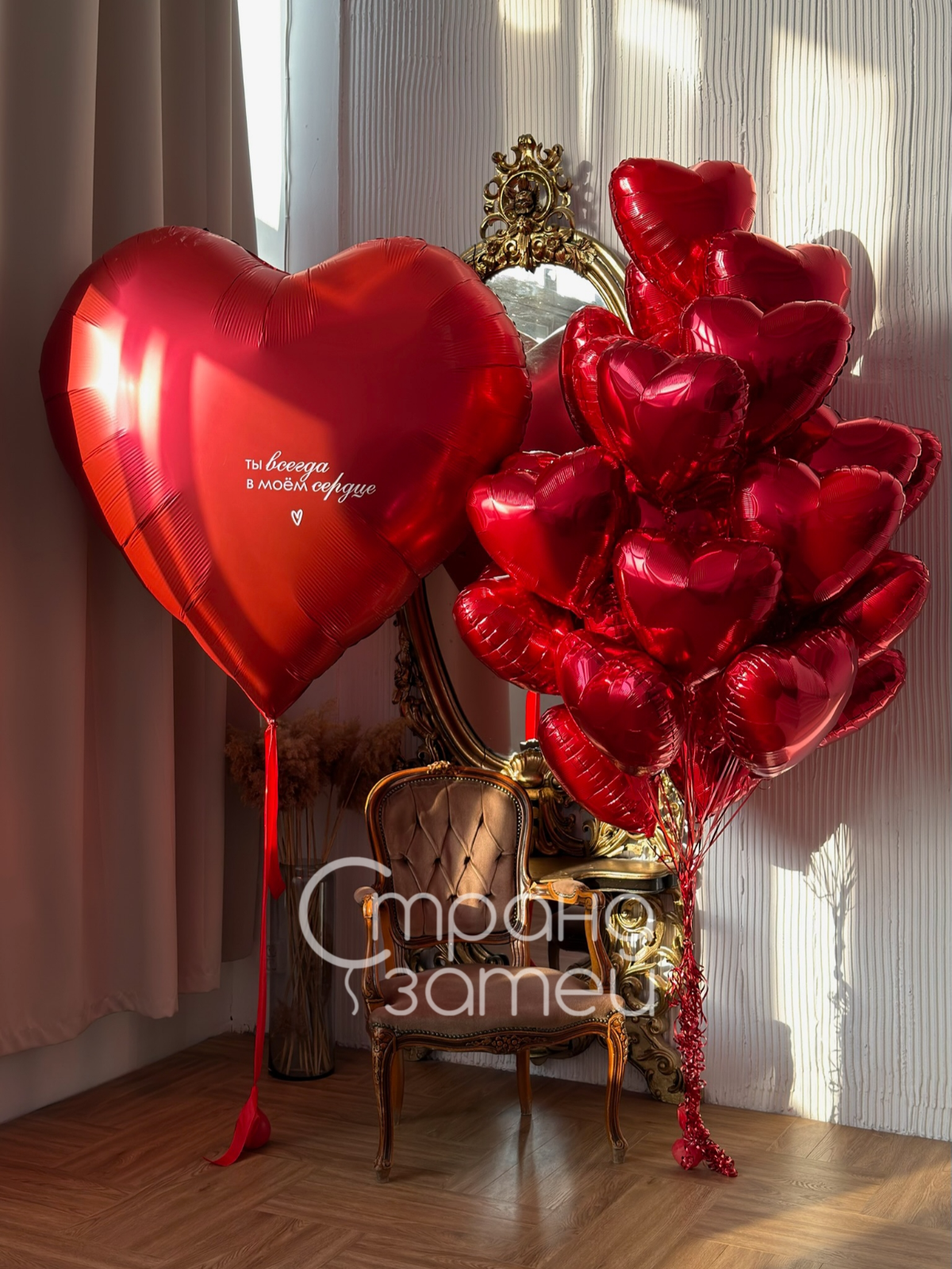 Сет шаров «Огромная любовь» — трогательное оформление для свадьбы, годовщины, Дня святого Валентина или особого признания. В центре композиции — гигантское красное сердце 68"/165 см с надписью «Ты всегда в моём сердце», дополненное облаком из 30 красных сердец.