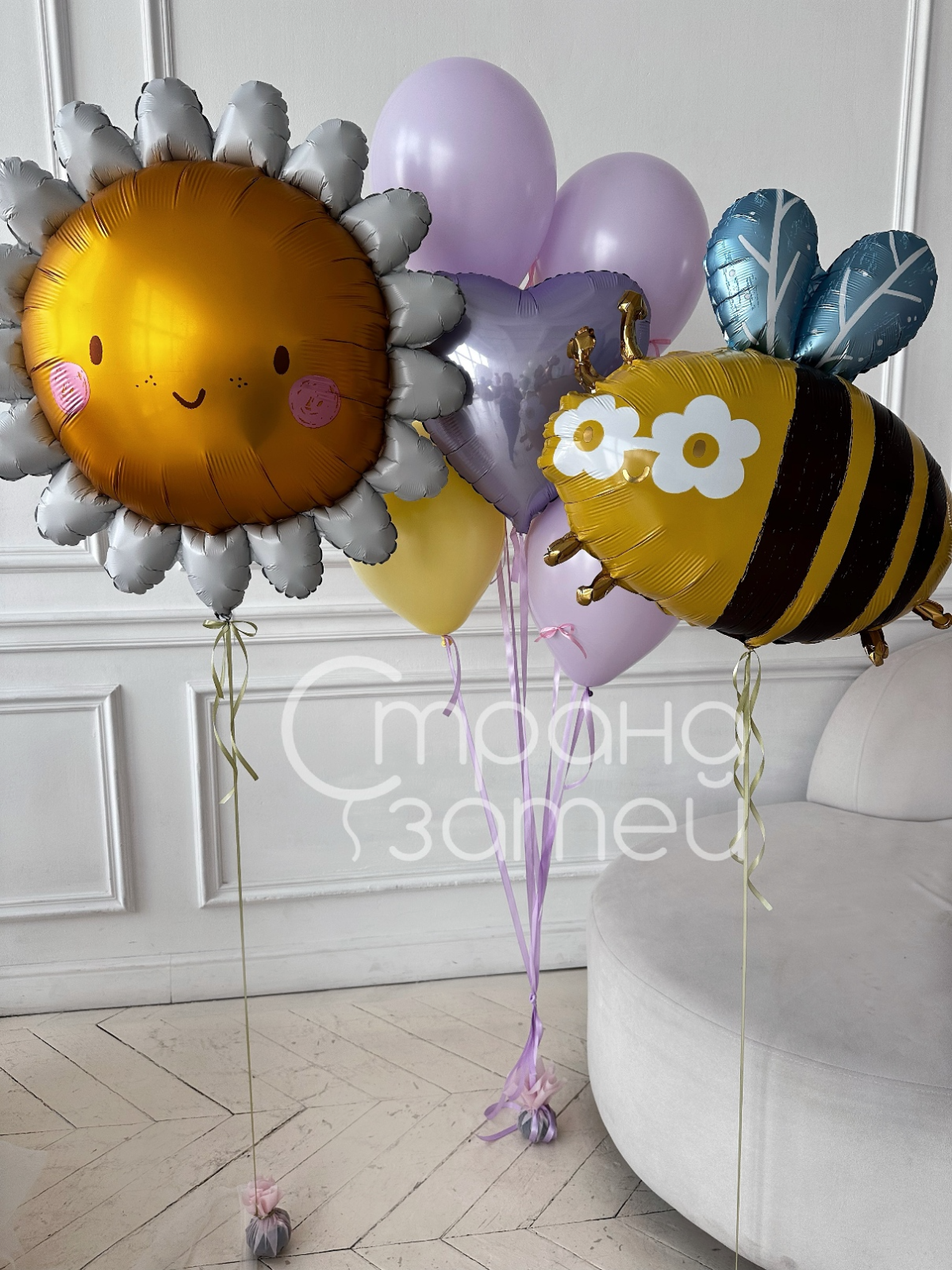 Сет шаров «Пчёлка на солнышке» — яркое оформление в жёлто‑лиловой гамме для девочки или девушки. Фигура солнышка и пчёлки в сочетании с пастельным фонтана с сердцем создают атмосферу весны и подойдут для 8 Марта, дня рождения или милого сюрприза.
