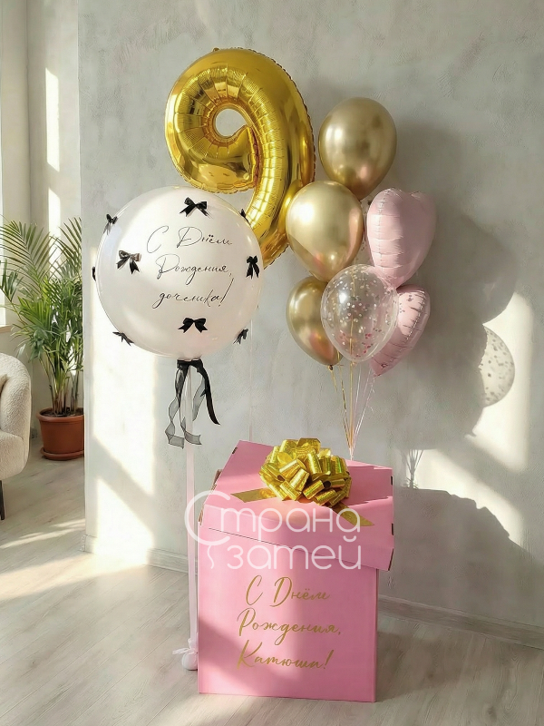 Надписи на коробке и шаре-гиганте, а также цвета шаров и размер коробки можно изменить под ваш праздник; цена указана за пример набора на фото.