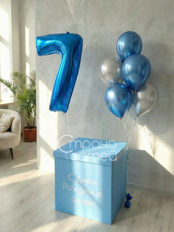 Сет «Секрет» сочетает большую голубую коробку-сюрприз с надписью, крупную цифру и аккуратный фонтан из хромированных шаров. При открытии коробки создаётся эффект неожиданности, а сама композиция выглядит современно и аккуратно в любой комнате. Набор подойдёт для домашнего праздника, студийной съёмки или праздника в кафе.