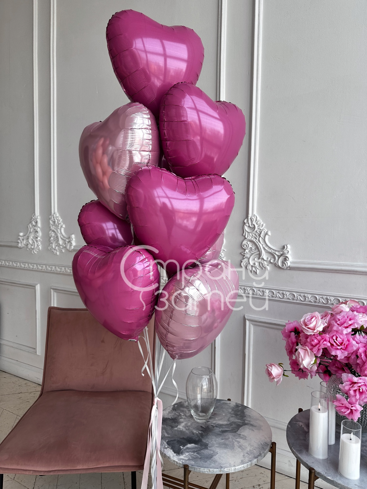 • Фонтан из 10 фольгированных шаров‑сердец 18″ на атласных лентах