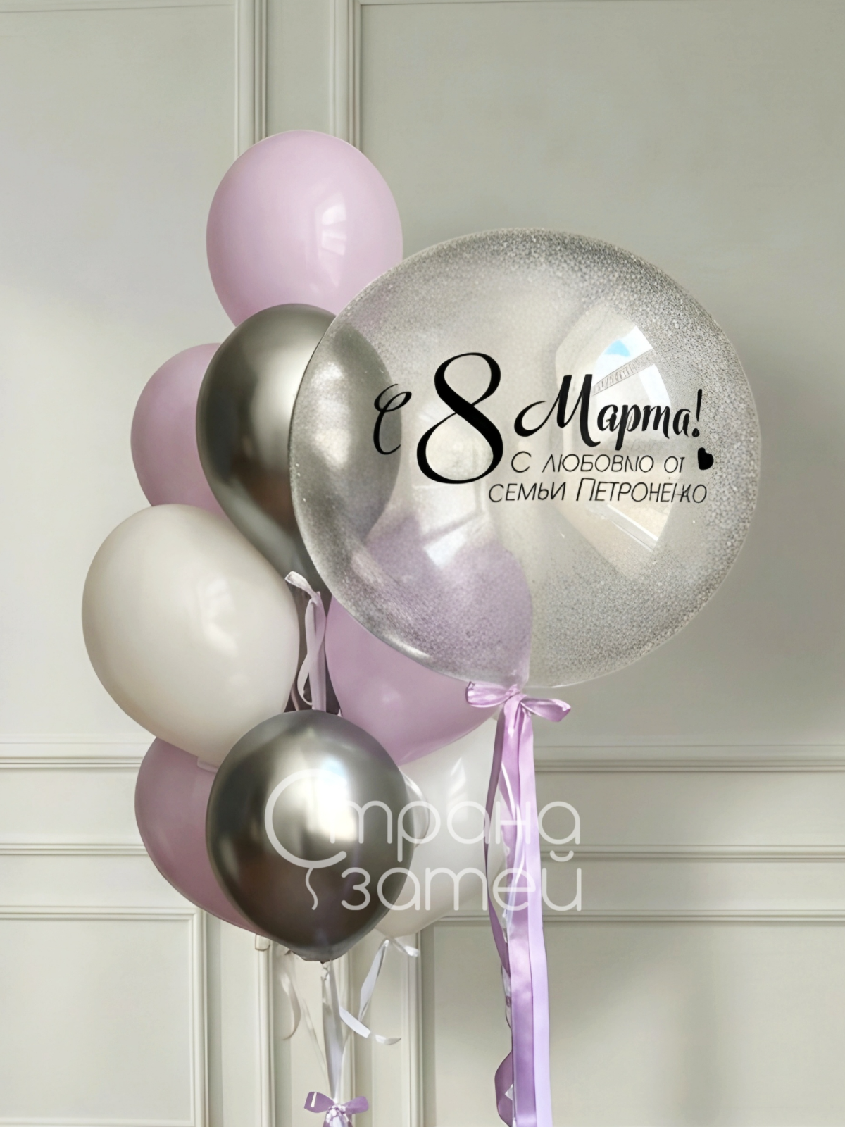 Сет «Серебряный март» оформлен в мягкой бело‑серебристой и сиреневой палитре и станет аккуратным поздравлением на 8 Марта для особенной девушки для неё. Прозрачный шар‑баблс с конфетти и персональной надписью и фонтан из пастельных и хромовых шаров с бантиками создают лёгкое, воздушное настроение и аккуратно смотрятся в светлом интерьере дома или студии.