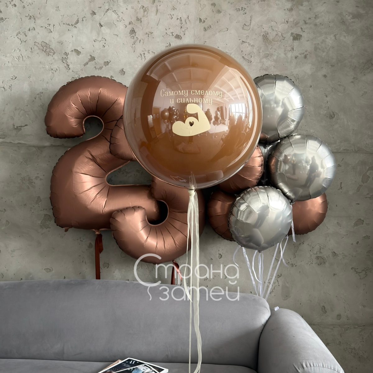 Сет «Смелому и сильному» сочетает в себе лаконичный дизайн и выразительные детали. Шар‑гигант с персональной надписью подчёркивает особое отношение к адресату, а крупные цифры и круги металлик формируют объёмный, статусный букет. Композиция подойдёт для оформления кабинета, дома или ресторана и может выступать готовой мини‑фотозоной.
