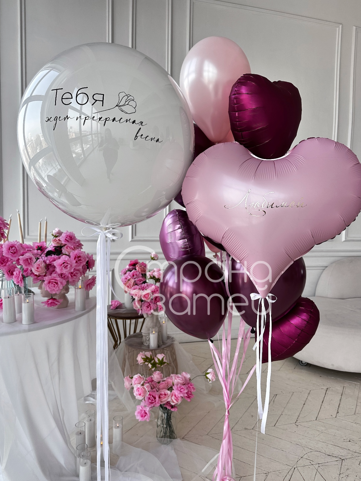 Текст на шаре-гиганте и сердцах можно изменить под ваш повод: имя, обращение или короткий комплимент. По согласованию допускается лёгкая корректировка оттенков латексных шаров и сердец в пределах похожей цветовой палитры.