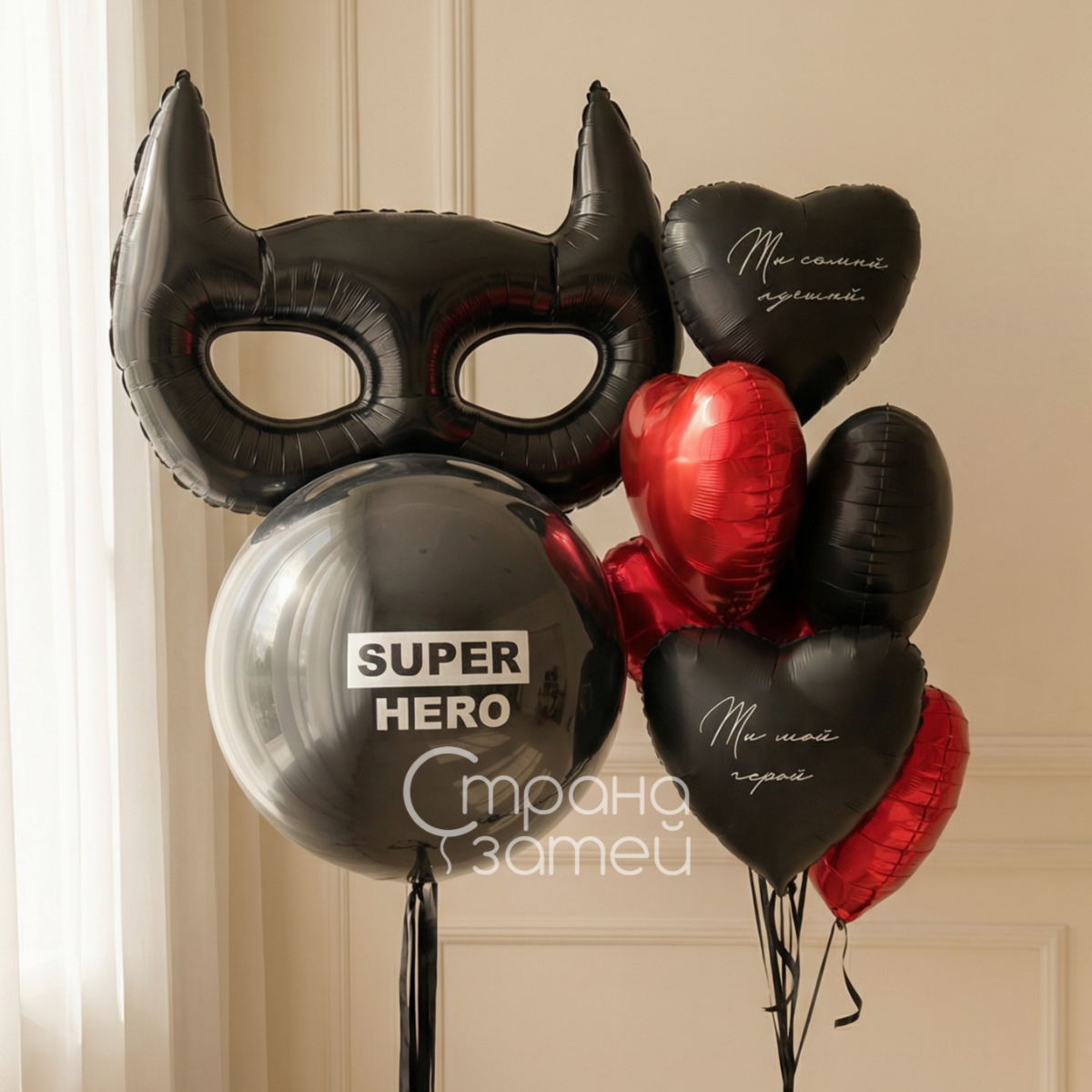 Сет шаров «Твой герой» — яркий романтический набор для него на 14 февраля. Маска Бэтмена, прозрачный шар с текстом и алые сердца с надписями создают ощущение супергеройского сюрприза и отлично смотрятся на фото, превращая комнату в стильную фотозону.