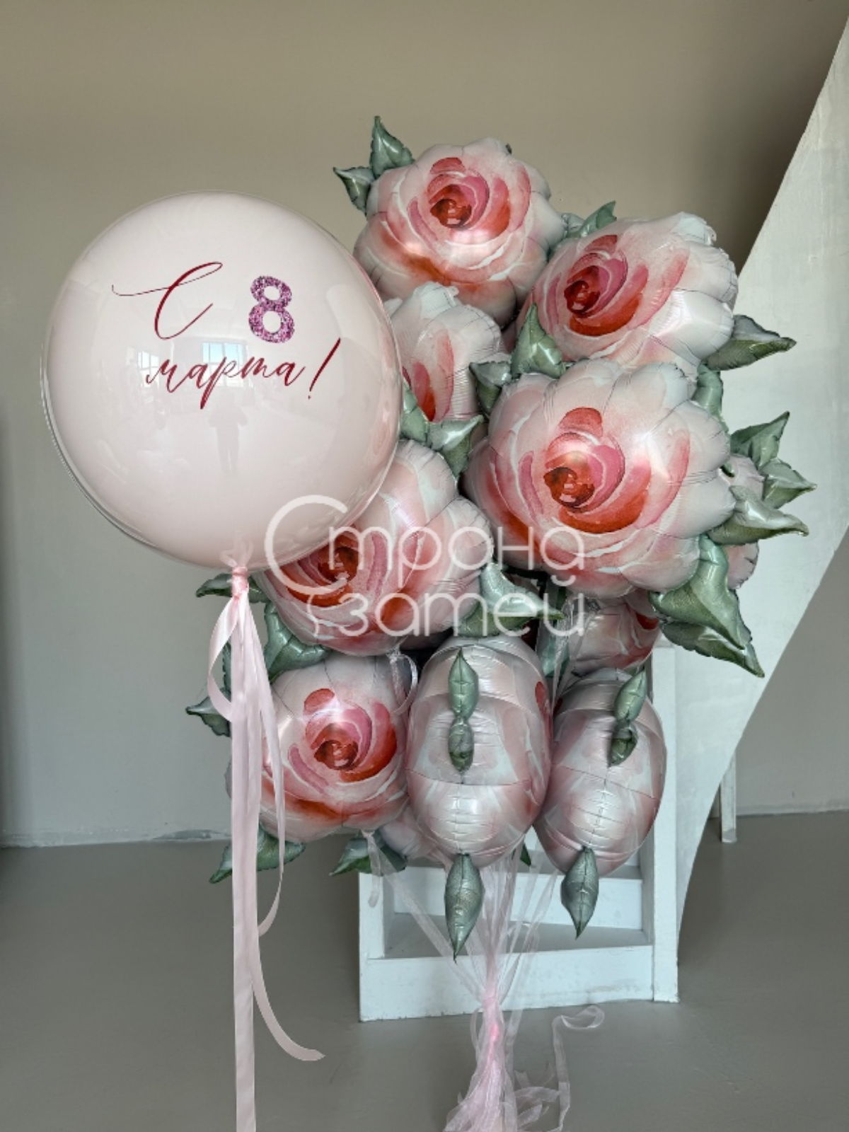 Текст на шаре‑гиганте можно задать любой: «С 8 Марта», «С днём рождения», имя или короткое признание; по желанию добавить цифру и дополнительные шары (за доплату).Доставка и упаковка