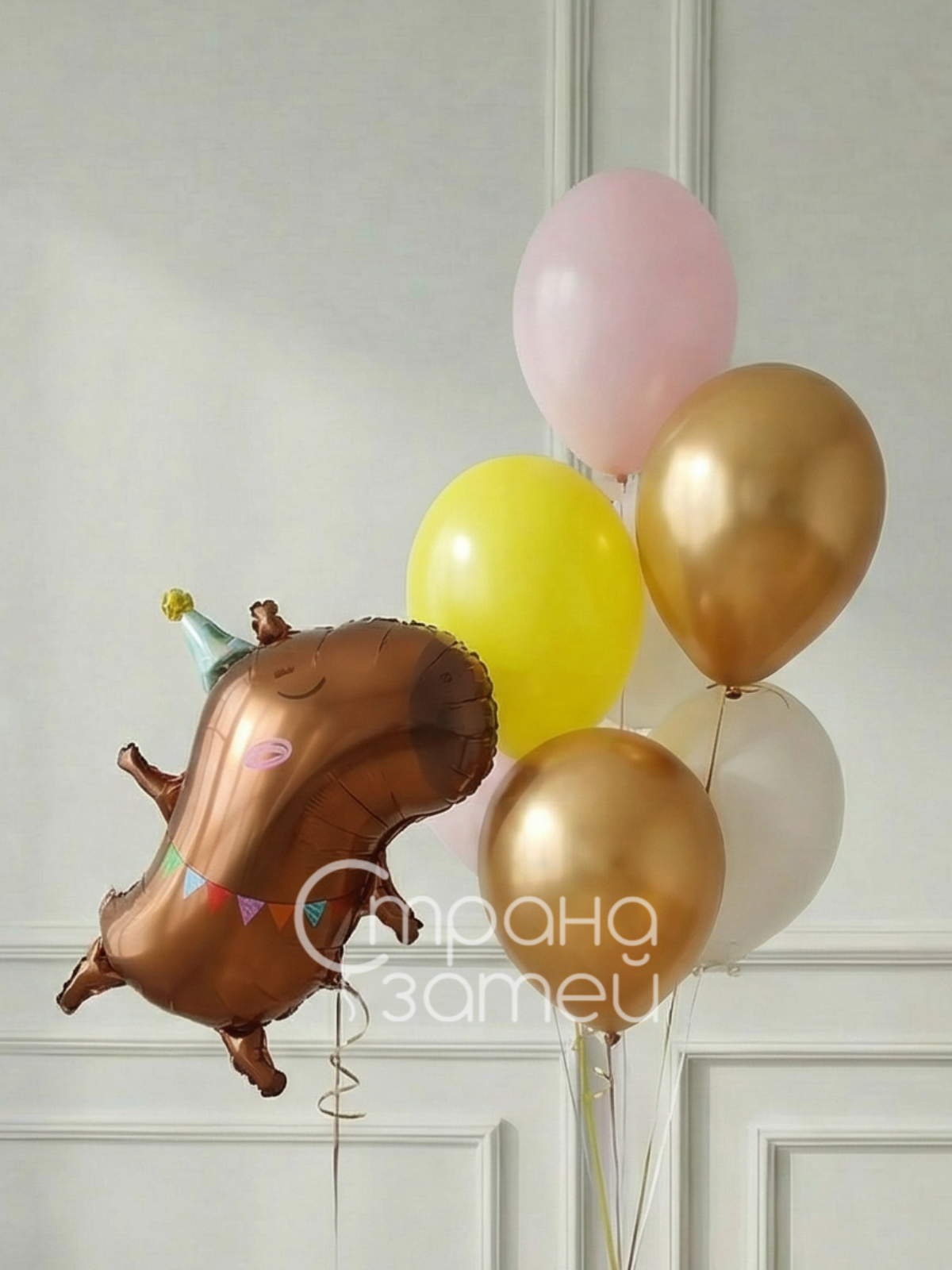 Сет шаров «Весёлая капибара» — яркое и необычное оформление праздника для мальчика, девочки, подростка или взрослого. Фигурный шар в виде капибары и фонтан из хромовых и пастельных шаров создают лёгкое настроение и смотрятся стильно на фотографиях.