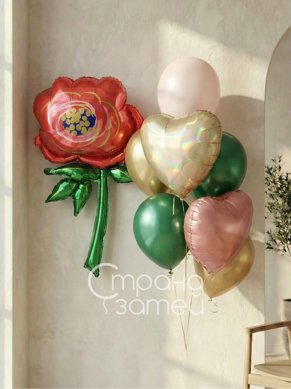 Сет «Золотая роза» сочетает крупную фигуру красной розы и фонтан из зелёных, золотистых, розовых и пастельных шаров. Он подойдёт как на 8 Марта, так и на день рождения для неё, когда хочется оформить поздравление в формате современного «букета» из шаров. Нюдовые и бордово‑красные акценты смотрятся благородно и женственно и хорошо вписываются в светлый интерьер дома, офиса или небольшой студии.