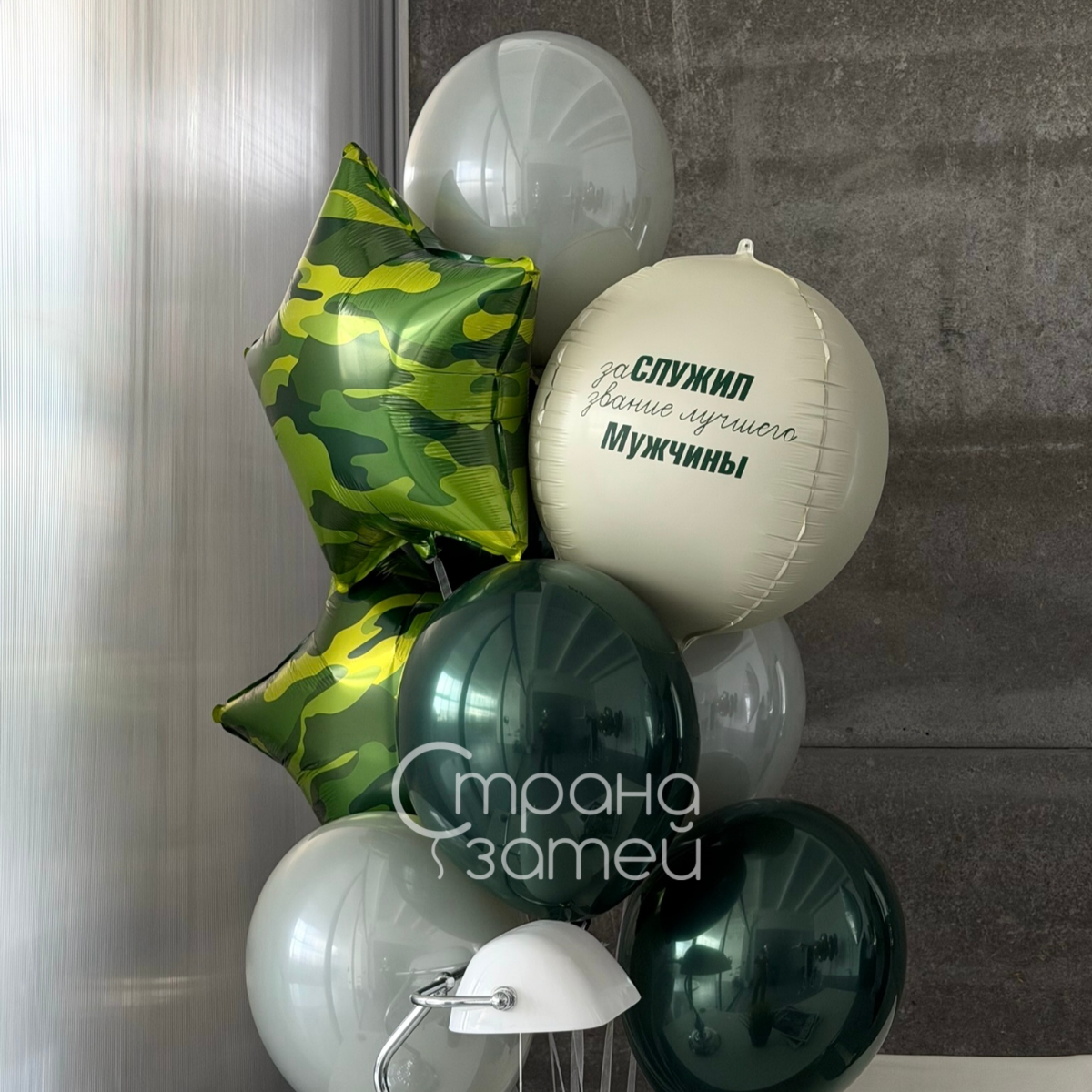 Сет шаров «Честь и отвага»4 700 руб.Честь и отвага для его праздника Стильный сет с шаром‑гигантом «стекло» и бежевым фонтана из звёзд и дабл шаров подчеркнёт 23 февраля или день рождения мужчины и красиво смотрится на фото. Самовывоз из 4 магазинов или доставка до двери ко времени, шары на грузиках и в транспортировочном пакете, гар...